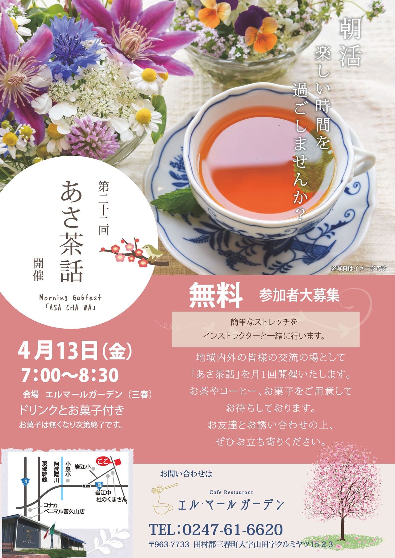 | 2018/3/13 | ★4/13 第22回 あさ茶話★ 地域内外の皆様の交流の場として「あさ茶話」を月1回開催いたします。参加無料 ドリンクとお菓子付き | |