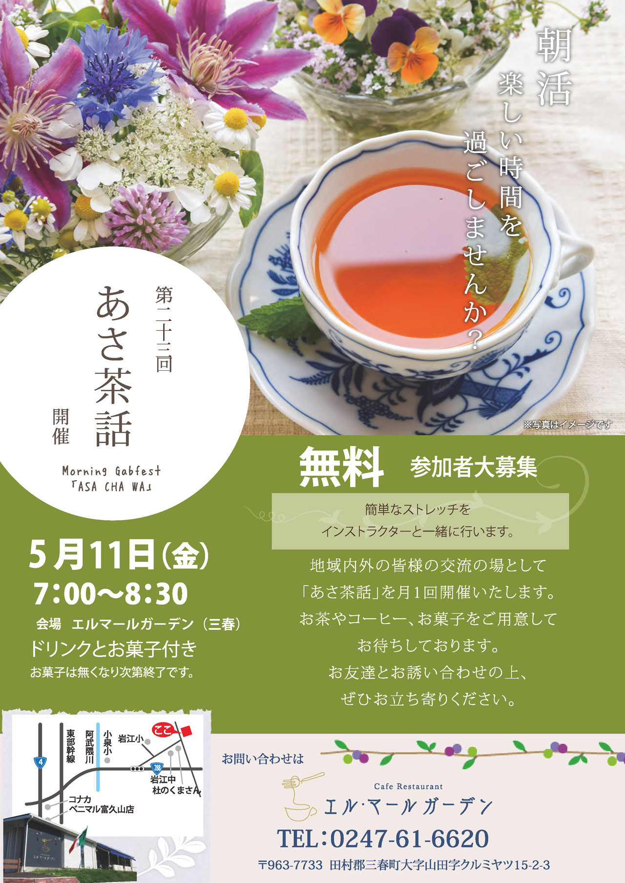 | 2018/4/16 | ★5/11 第23回 あさ茶話★ 地域内外の皆様の交流の場として「あさ茶話」を月1回開催いたします。参加無料 ドリンクとお菓子付き | |