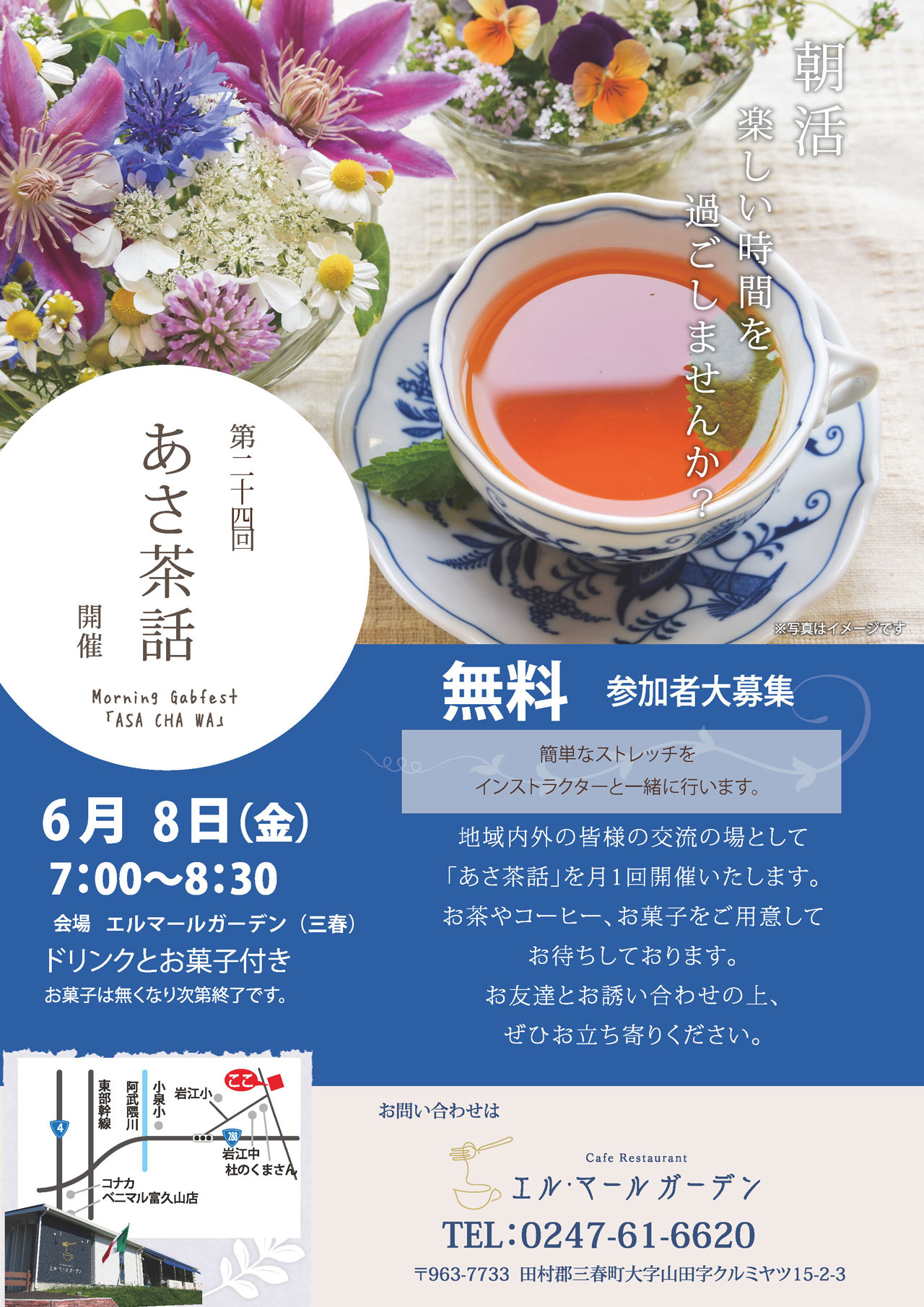| 2019/6/11 | ★7/12 第34回 あさ茶話★ 地域内外の皆様の交流の場として「あさ茶話」を月1回開催いたします。参加無料 ドリンクとお菓子付き | |