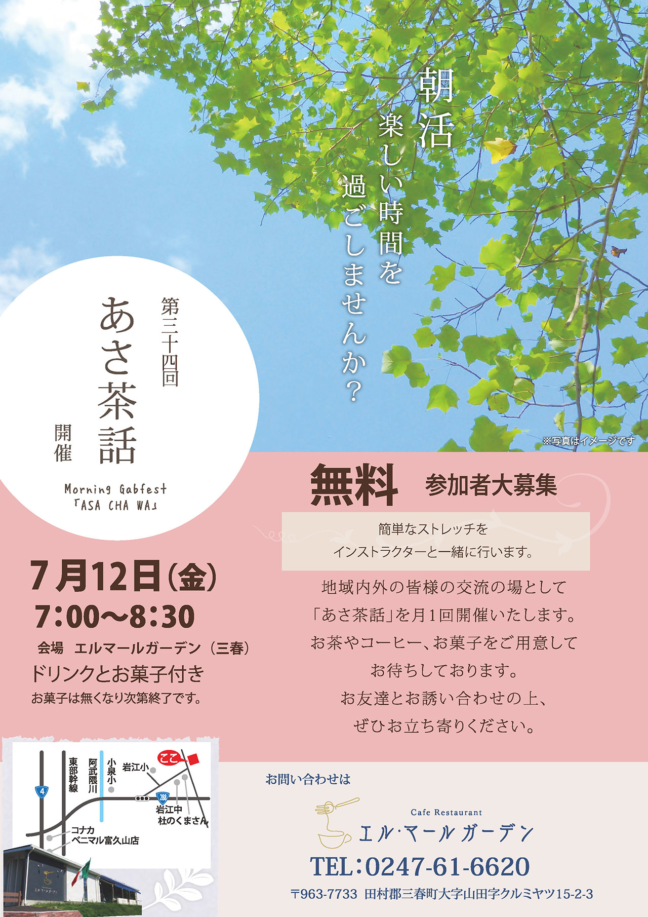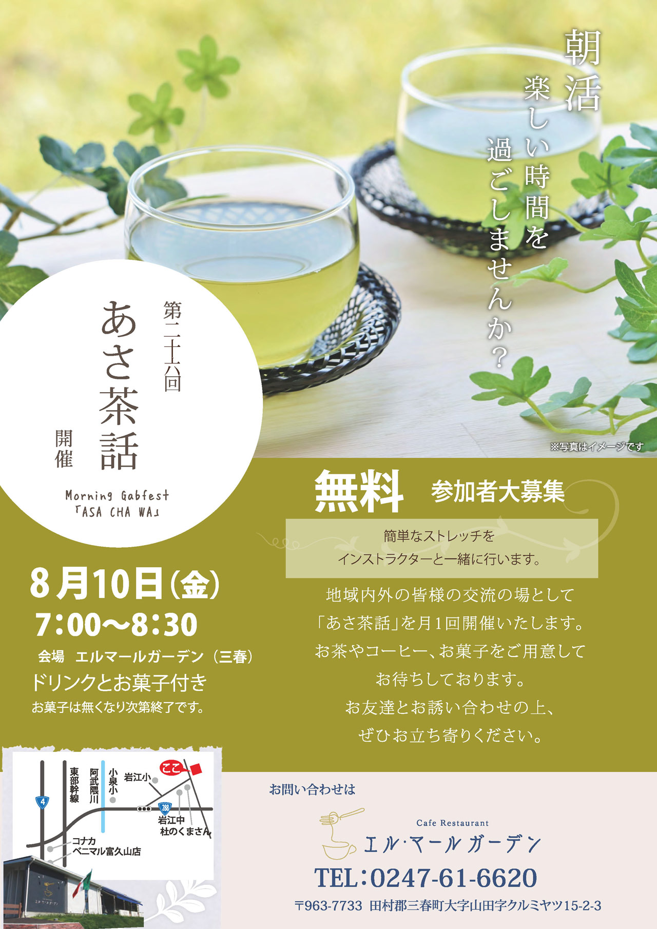 | 2018/7/30 | ★8/10 第26回 あさ茶話★ 地域内外の皆様の交流の場として「あさ茶話」を月1回開催いたします。参加無料 ドリンクとお菓子付き | |