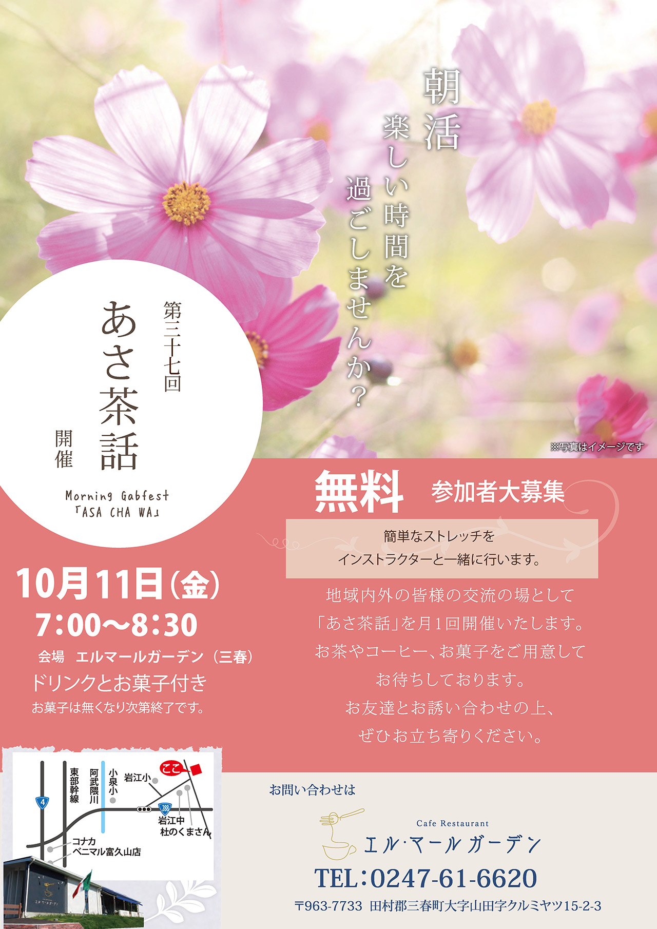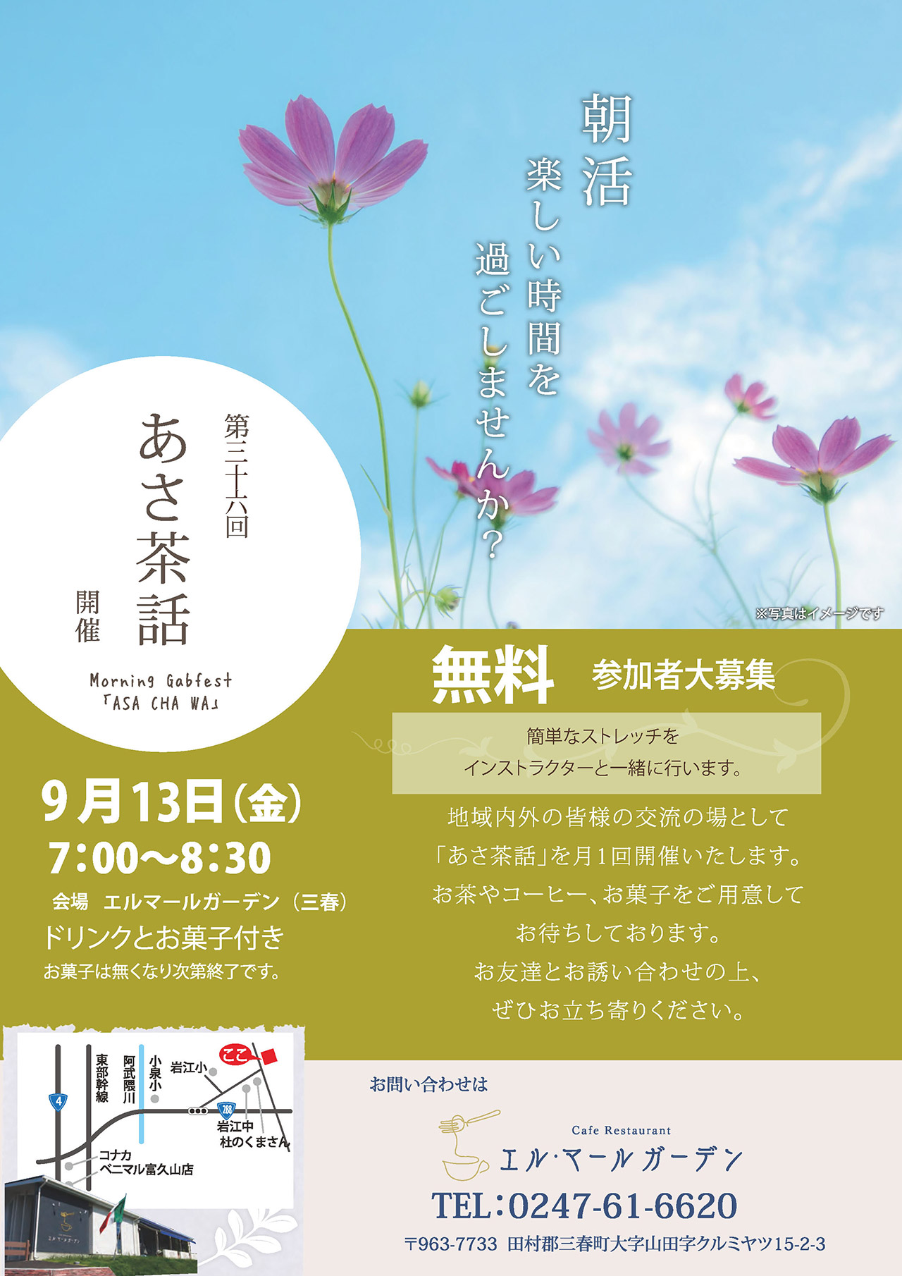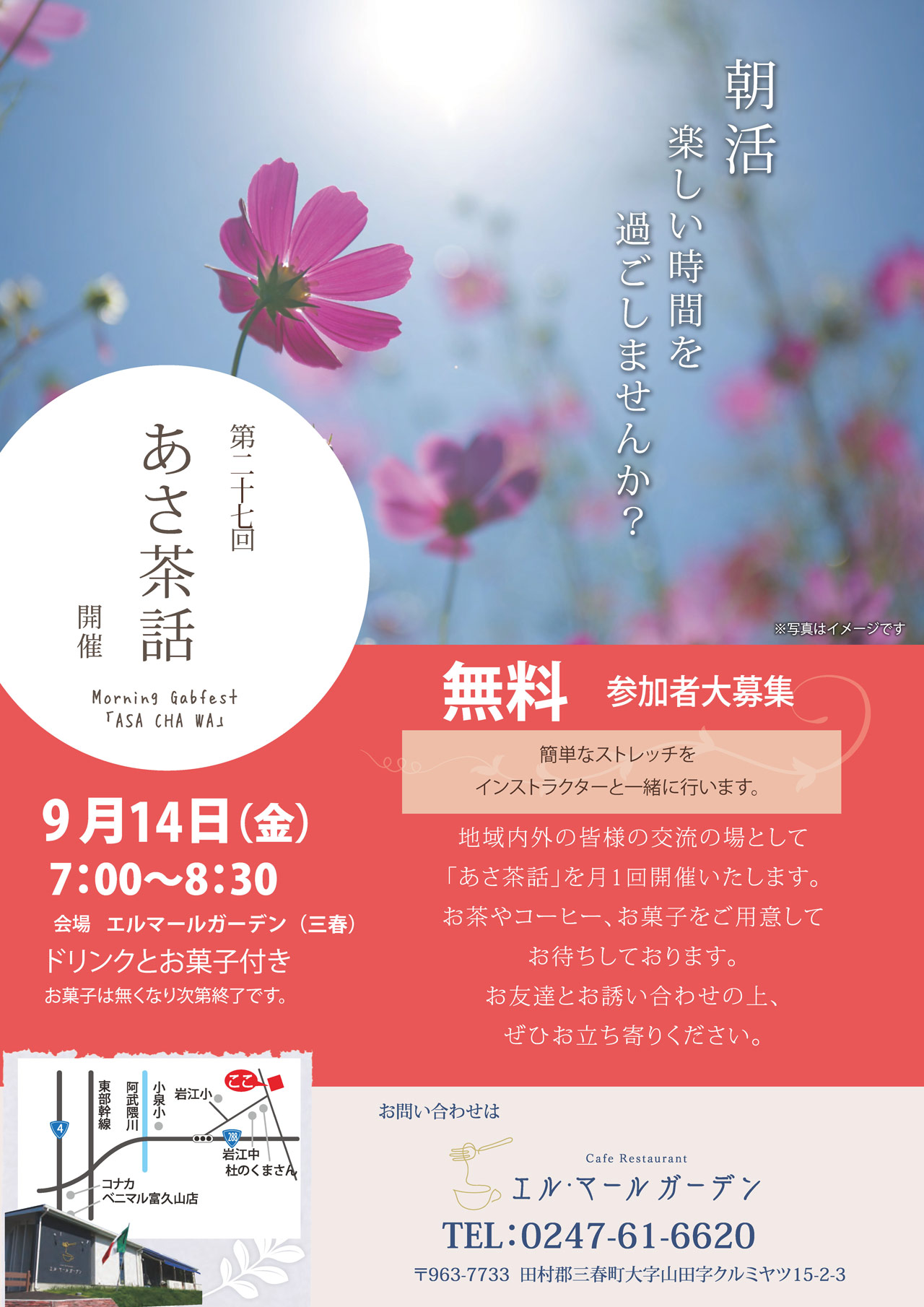 | 2019/9/1 | ★9/13 第36回 あさ茶話★ 地域内外の皆様の交流の場として「あさ茶話」を月1回開催いたします。参加無料 ドリンクとお菓子付き | |
