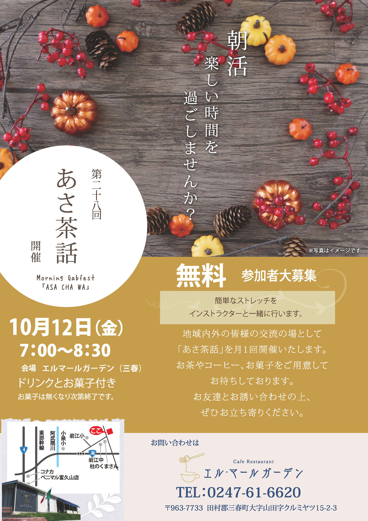 | 2018/9/19 | ★10/12 第28回 あさ茶話★ 地域内外の皆様の交流の場として「あさ茶話」を月1回開催いたします。参加無料 ドリンクとお菓子付き | |
