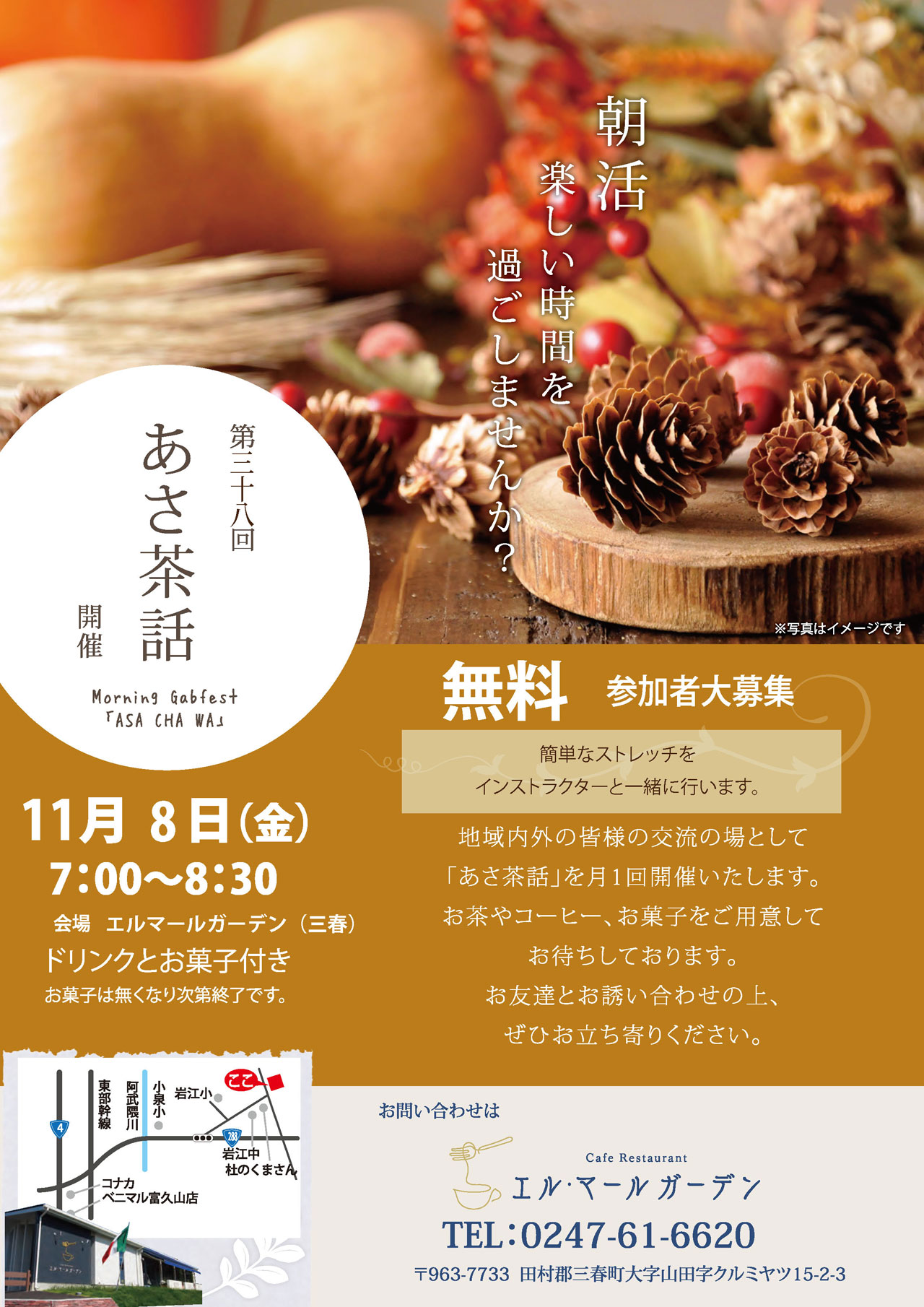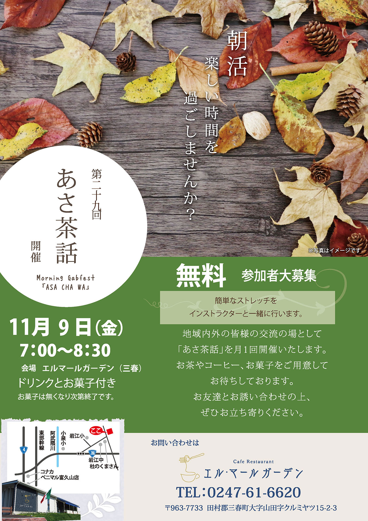 | 2018/10/24 | ★11/9 第29回 あさ茶話★ 地域内外の皆様の交流の場として「あさ茶話」を月1回開催いたします。参加無料 ドリンクとお菓子付き | |
