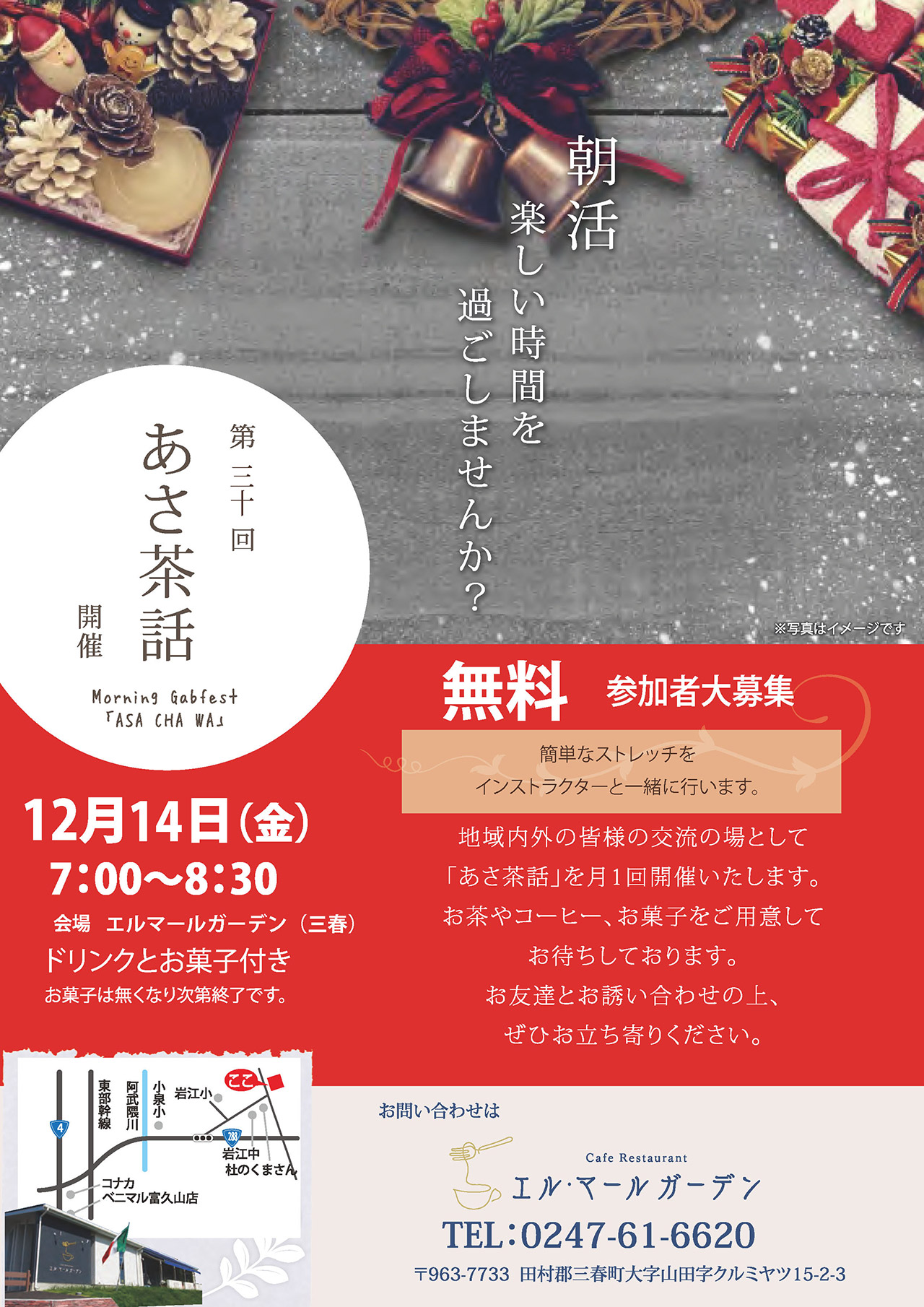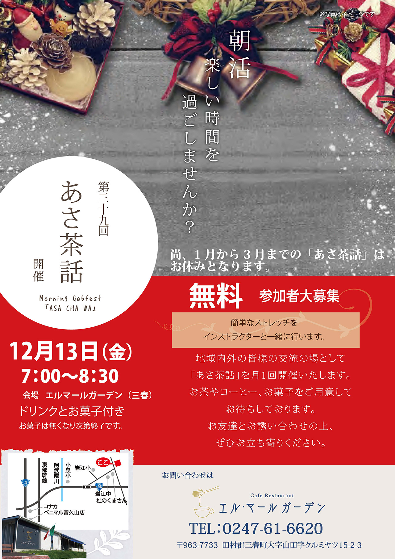 | 2018/11/9 | ★12/14 第30回 あさ茶話★ 地域内外の皆様の交流の場として「あさ茶話」を月1回開催いたします。参加無料 ドリンクとお菓子付き | |