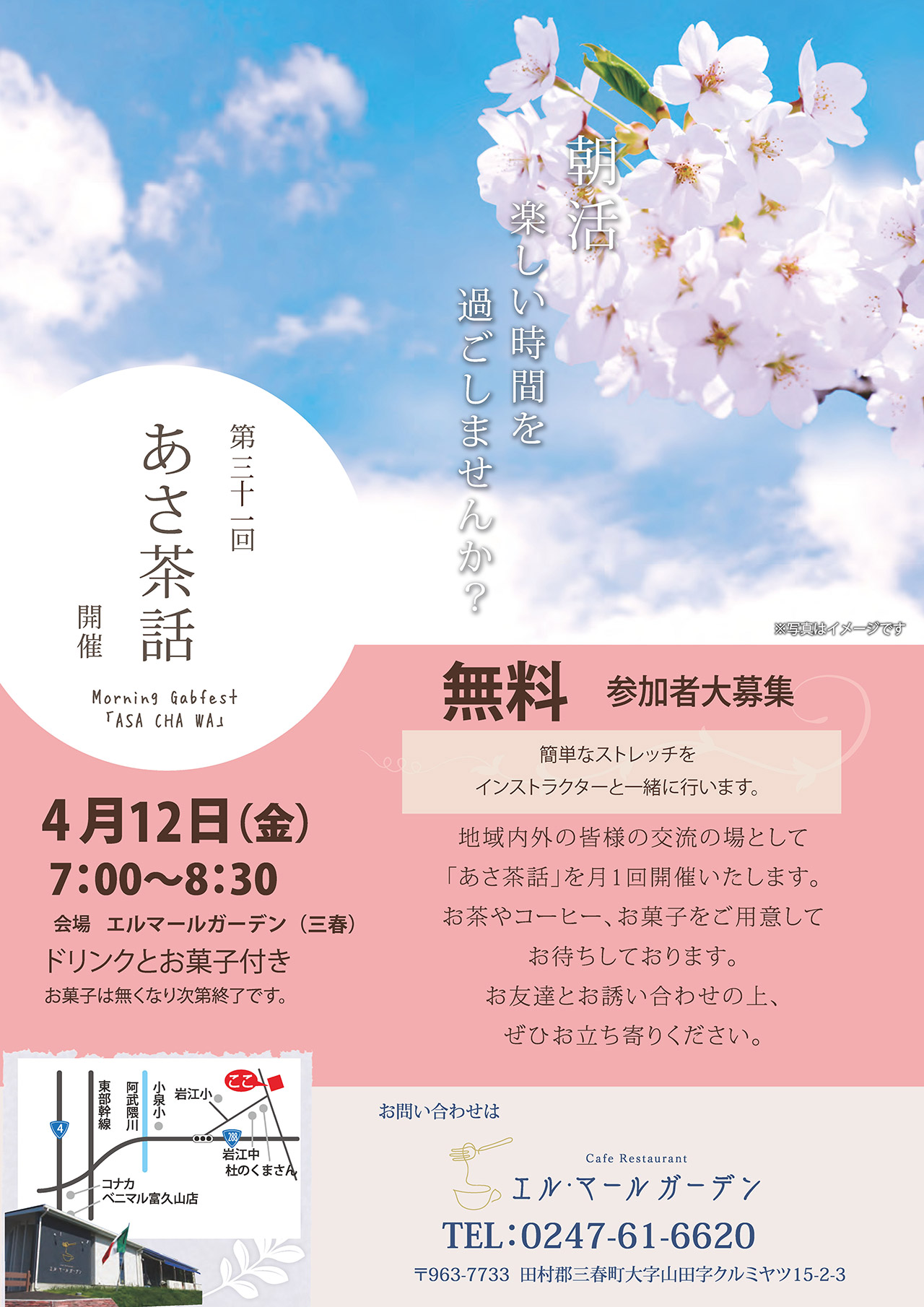 | 2019/3/20 | ★4/12 第31回 あさ茶話★ 地域内外の皆様の交流の場として「あさ茶話」を月1回開催いたします。参加無料 ドリンクとお菓子付き | |