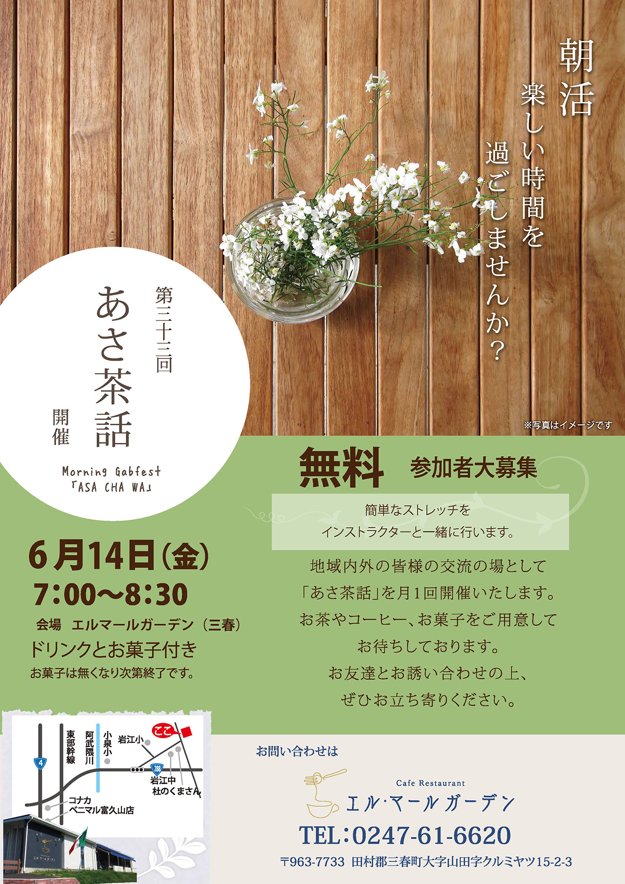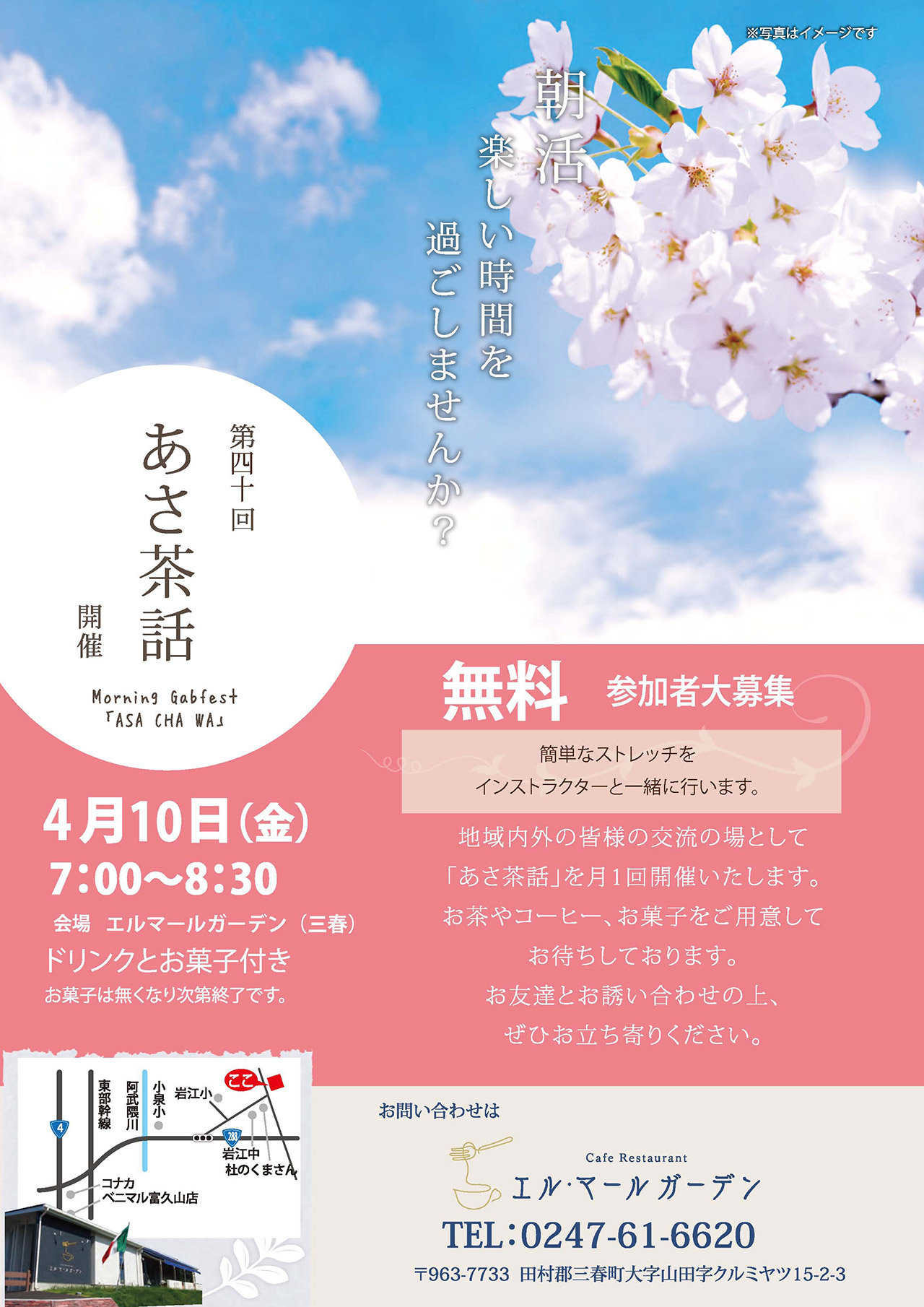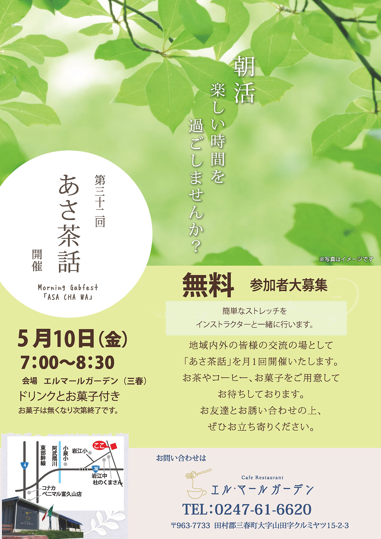 | 2019/5/13 | ★6/14 第33回 あさ茶話★ 地域内外の皆様の交流の場として「あさ茶話」を月1回開催いたします。参加無料 ドリンクとお菓子付き | |