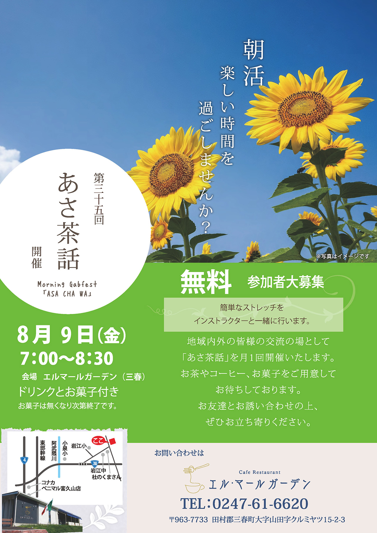 | 2019/7/16 | ★8/9 第35回 あさ茶話★ 地域内外の皆様の交流の場として「あさ茶話」を月1回開催いたします。参加無料 ドリンクとお菓子付き | |