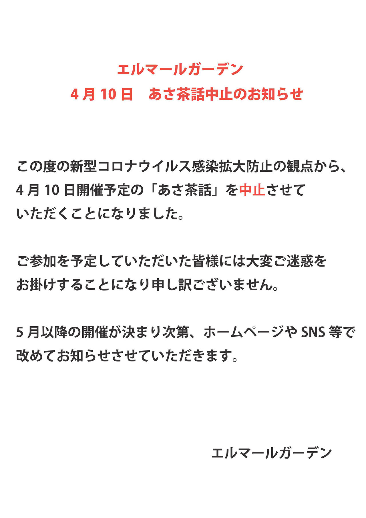 | 2019/4/25 | ★5/10 第32回 あさ茶話★ 地域内外の皆様の交流の場として「あさ茶話」を月1回開催いたします。参加無料 ドリンクとお菓子付き | |