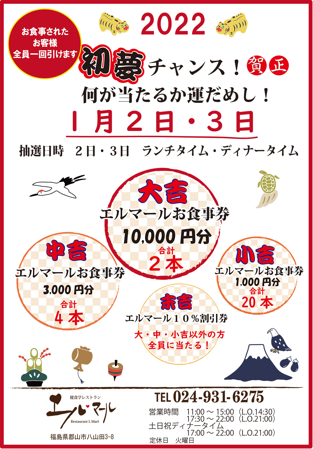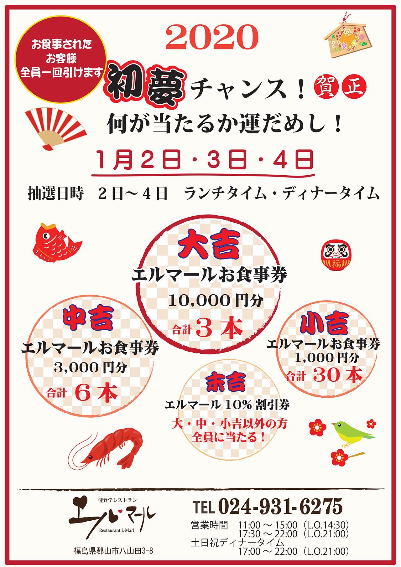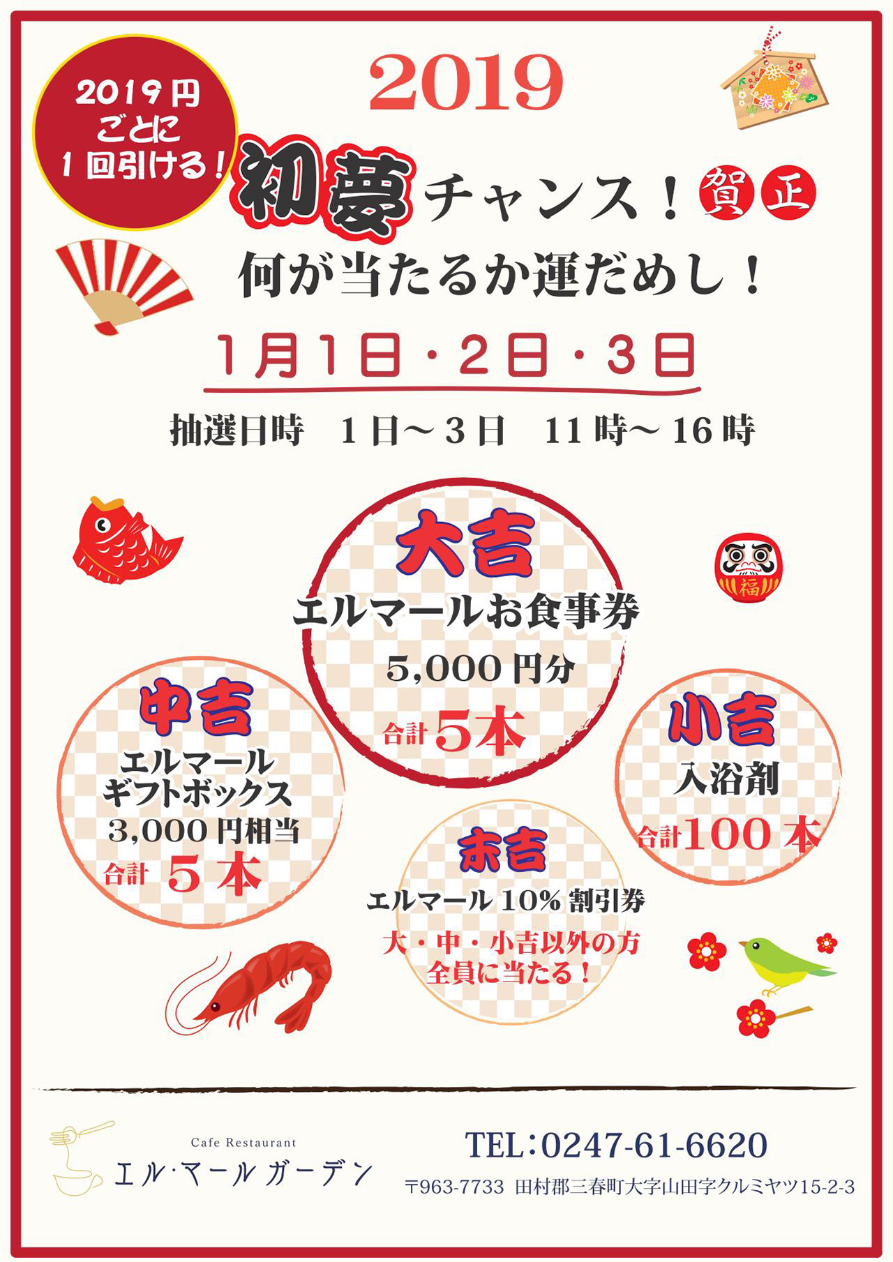 | 2018/12/26 | ★2019初夢チャンス!★ 何が当たるか運だめし! | |