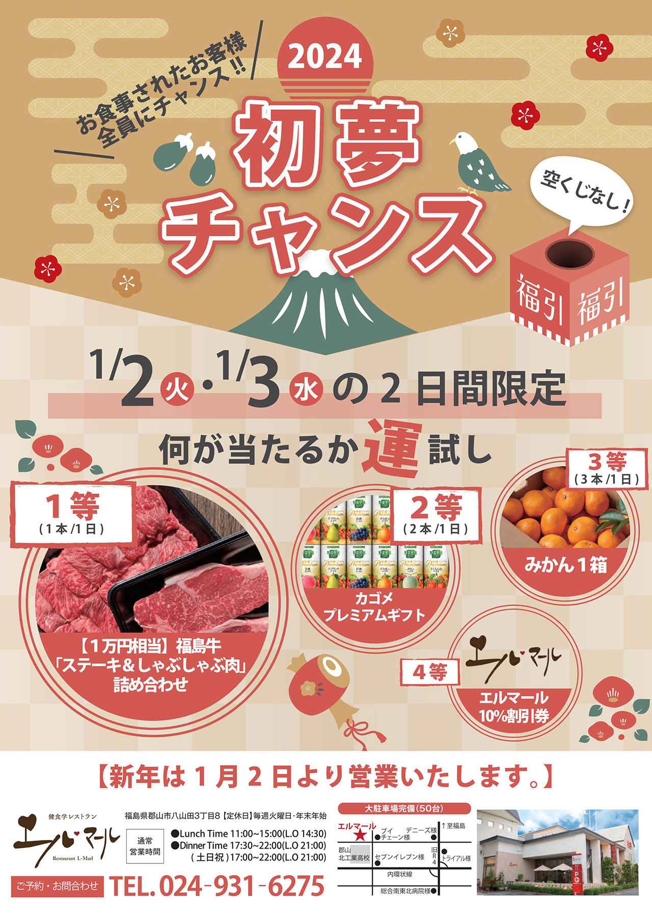| 2023/12/26 | ★2024初夢チャンス!★ 何が当たるか運だめし!豪華景品が当たるチャンス!空くじなし! | |
