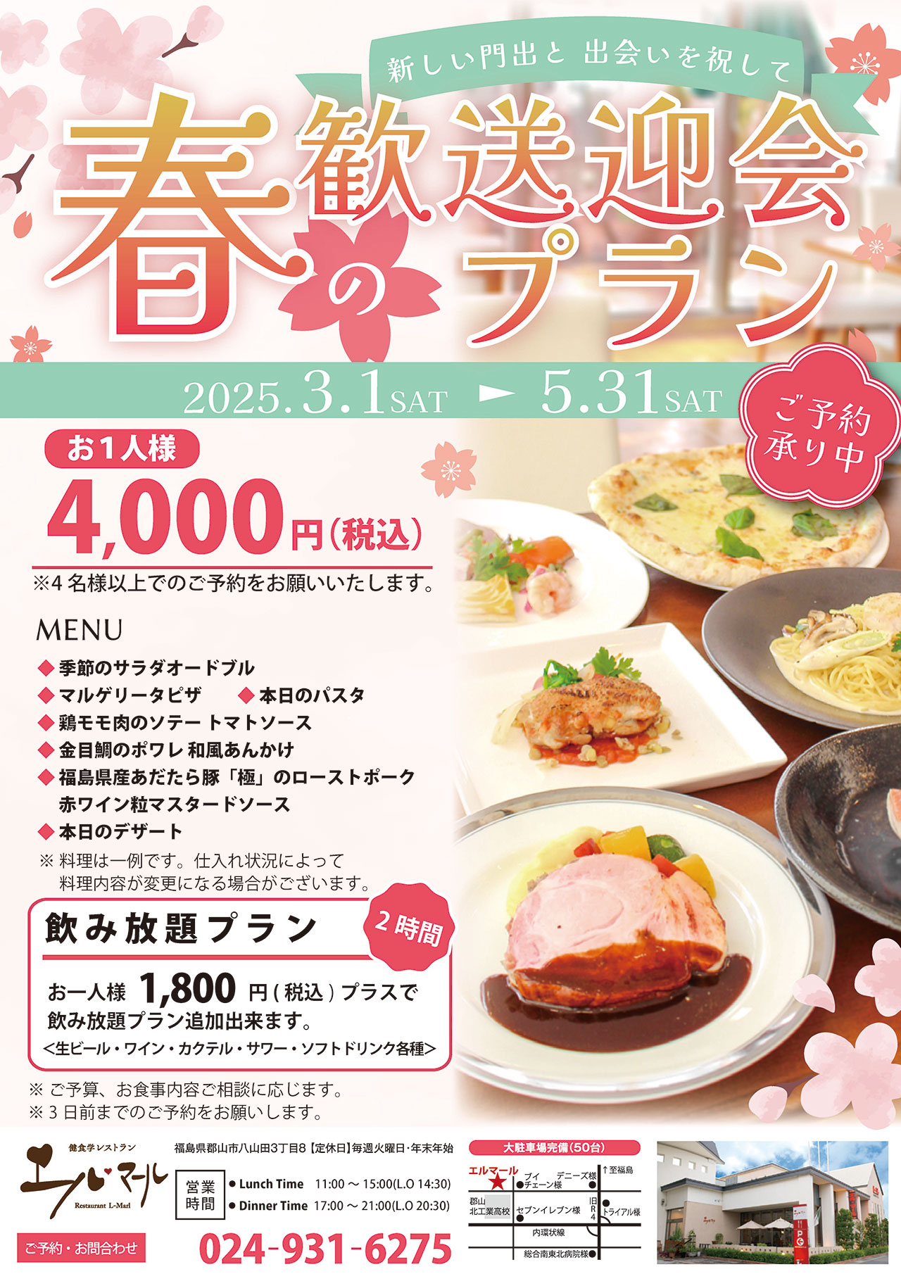 | 2025/3/1 | ★春の歓送迎会プラン★ 新しい門出と出会いを祝して | |