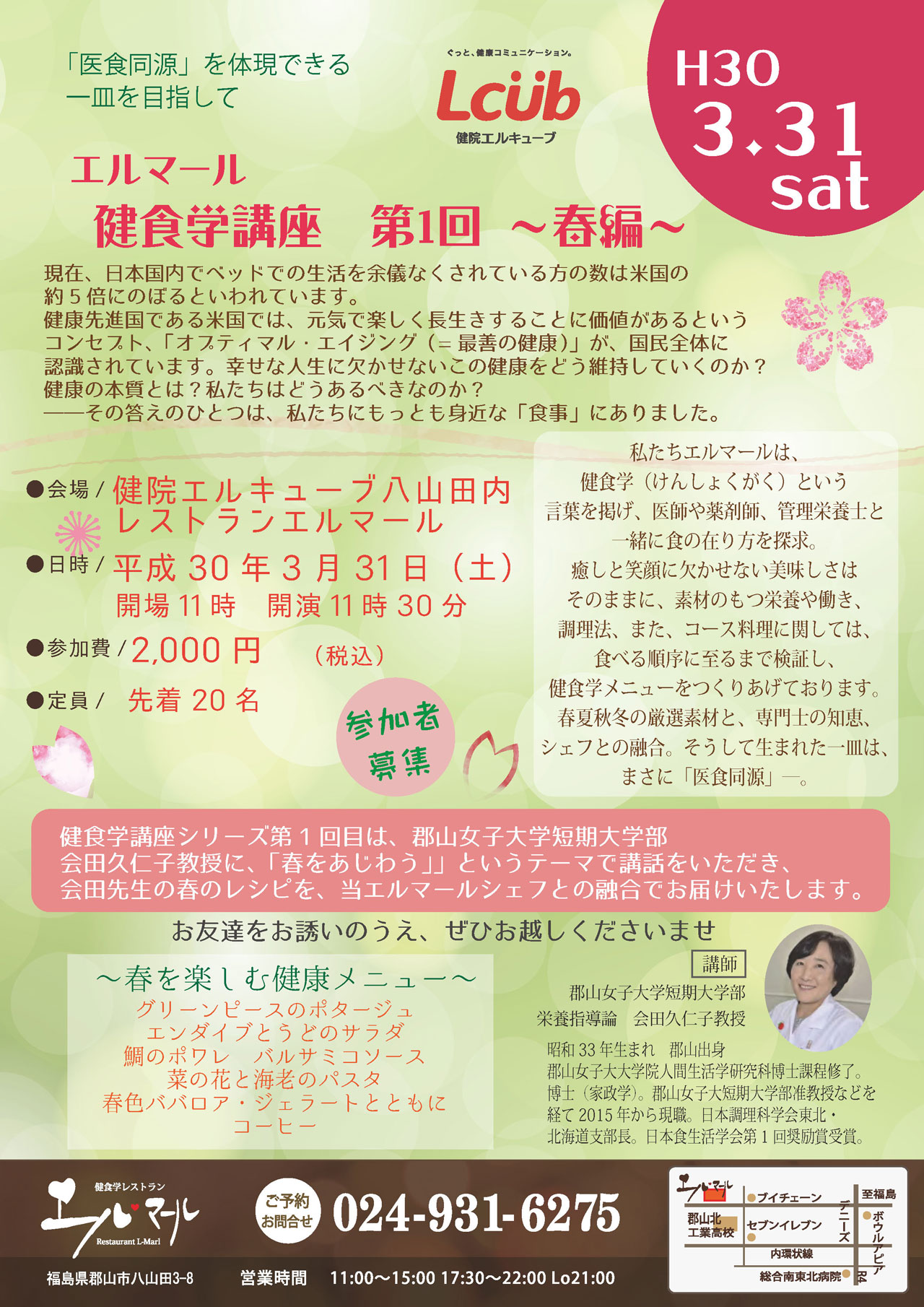 | 2018/3/16 | ★3/31 健食学講座 第1回~春編~★ 「医食同源」を体現できる1皿を目指して | |