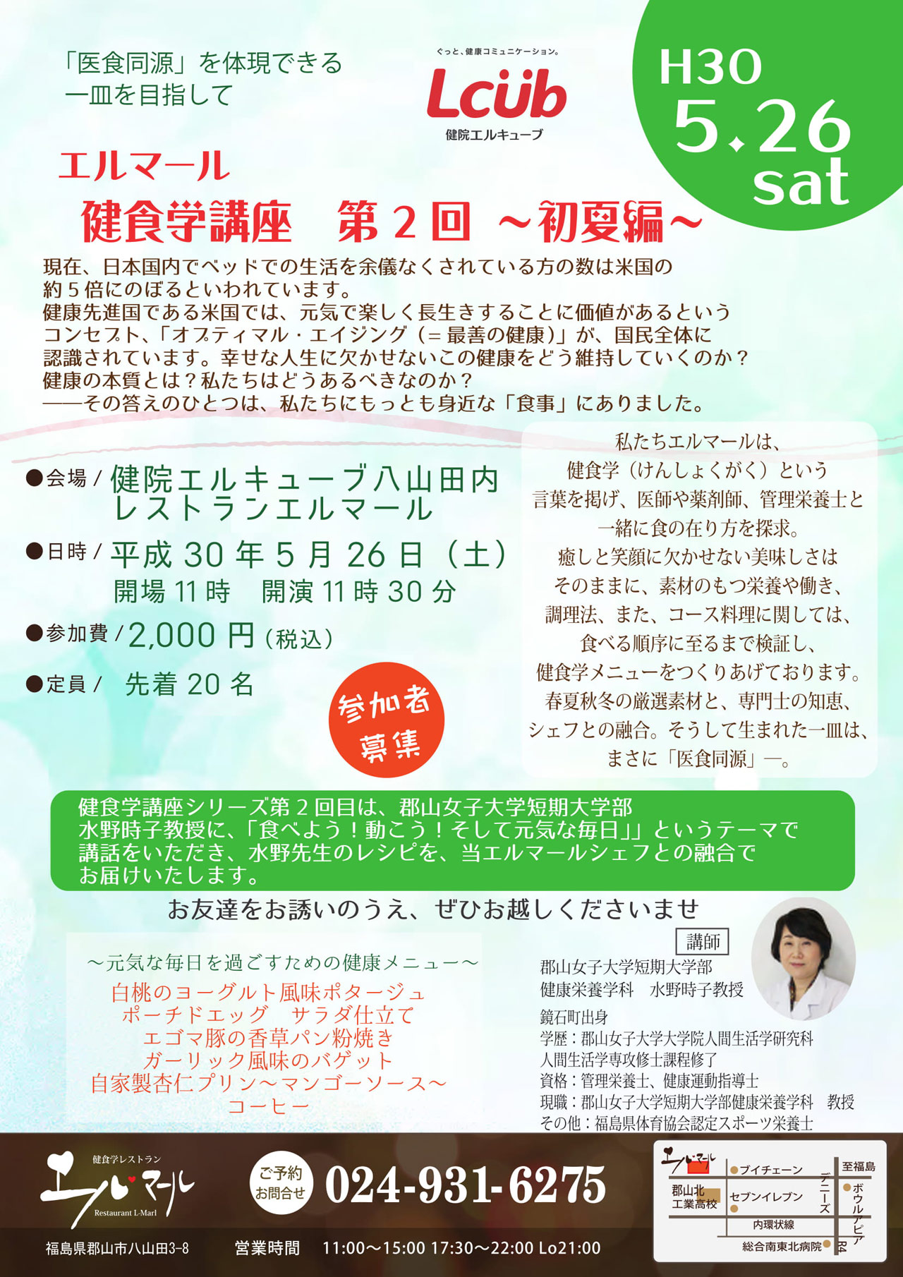 | 2018/4/28 | ★5/26 健食学講座 第2回~初夏編~★ 「医食同源」を体現できる1皿を目指して | |