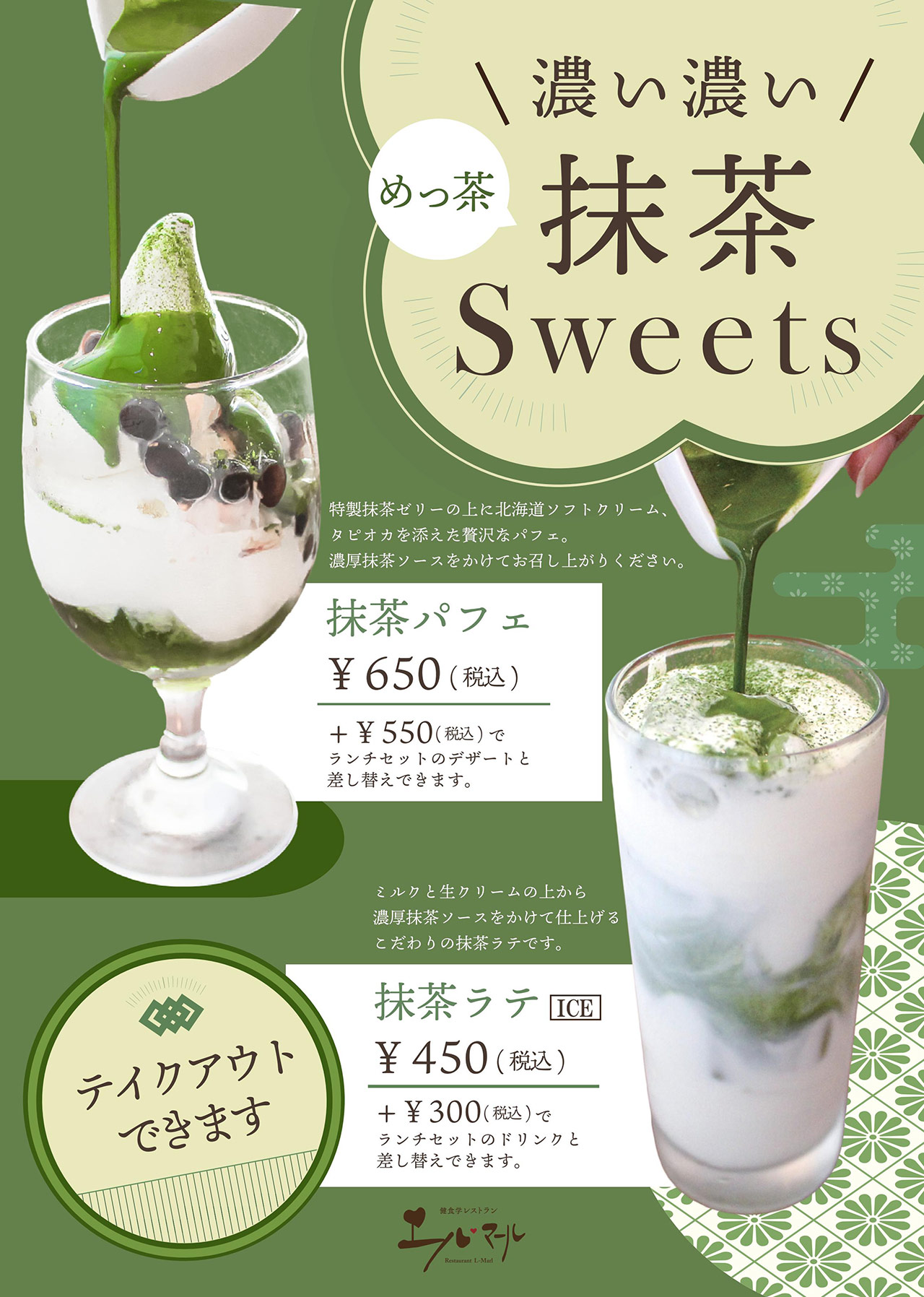 | 2024/5/31 | ★エルマール(八山田)★ 濃い濃い めっ茶 抹茶Sweets 特製抹茶ゼリーの上に北海道ソフトクリーム、タピオカを添えた贅沢なパフェ。濃厚抹茶ソースをかけてお召し上がりください。 | |