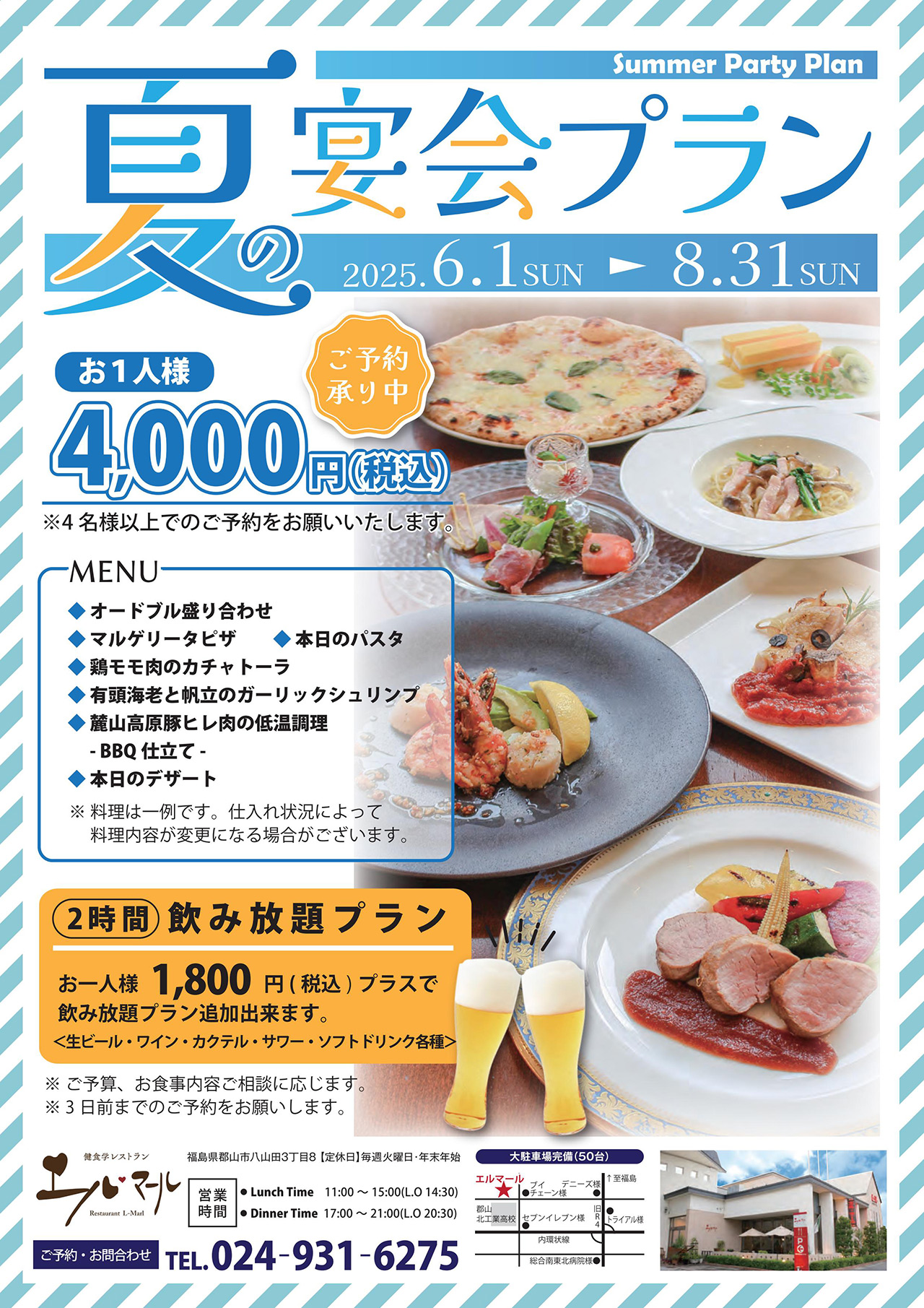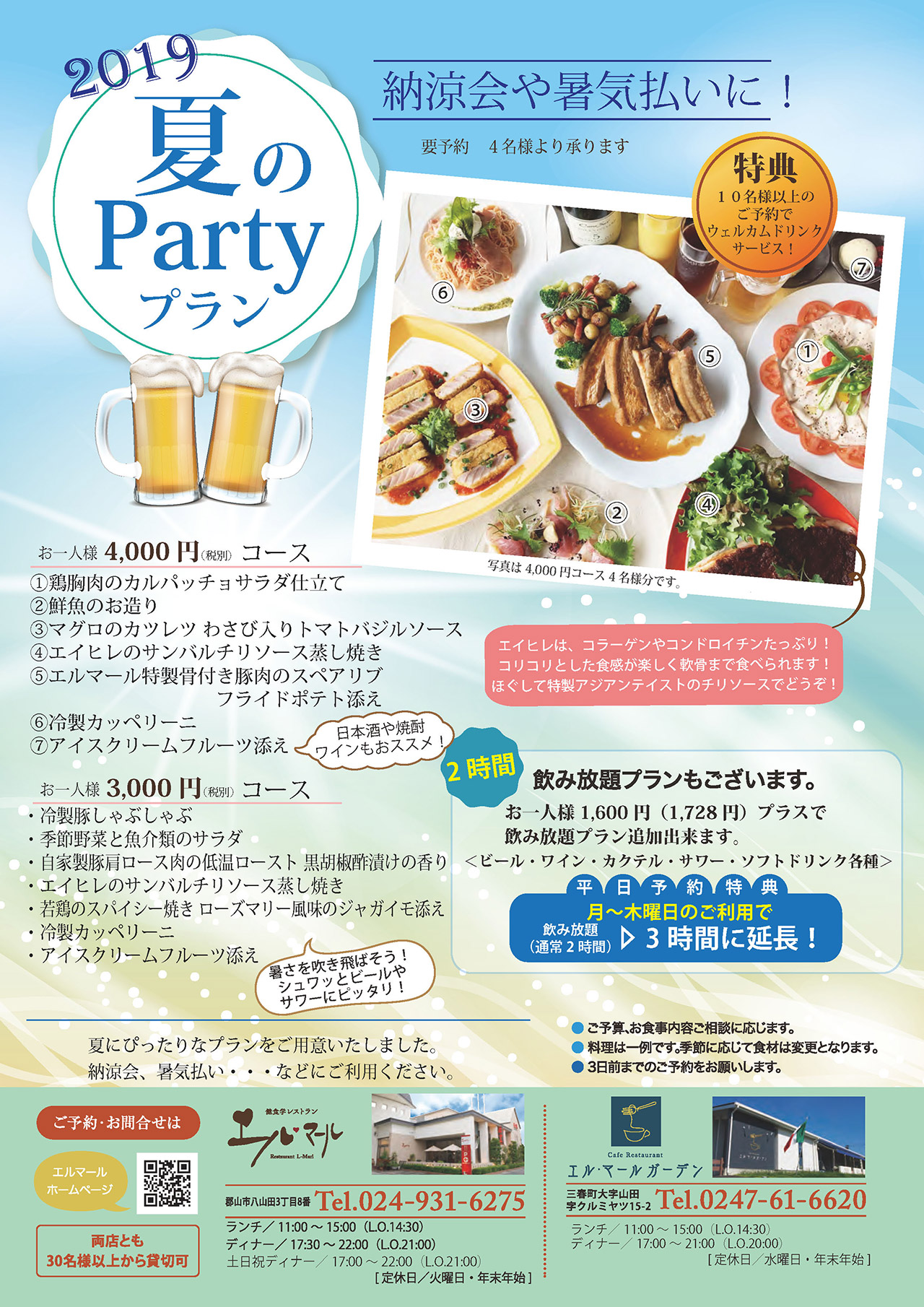 | 2019/6/3 | ★エルマール・エルマールガーデン共通 夏のPartyプラン★ 要予約 4名様より | |