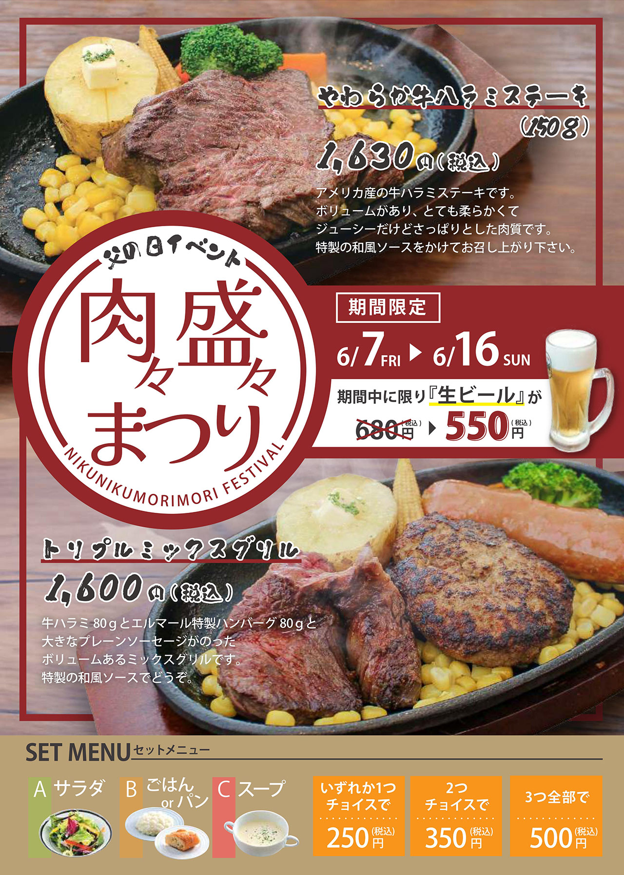 | 2024/6/6 | ★エルマール(八山田)★ 父の日イベント 肉々盛々まつり 【期間限定】6/7(金)~6/16(日) | |
