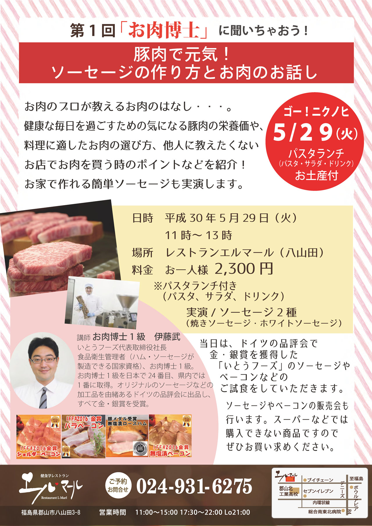 | 2018/4/2 | ★5/29第1回「お肉博士」に聞いちゃおう★ お肉のプロが教えるお肉の話...。 | |