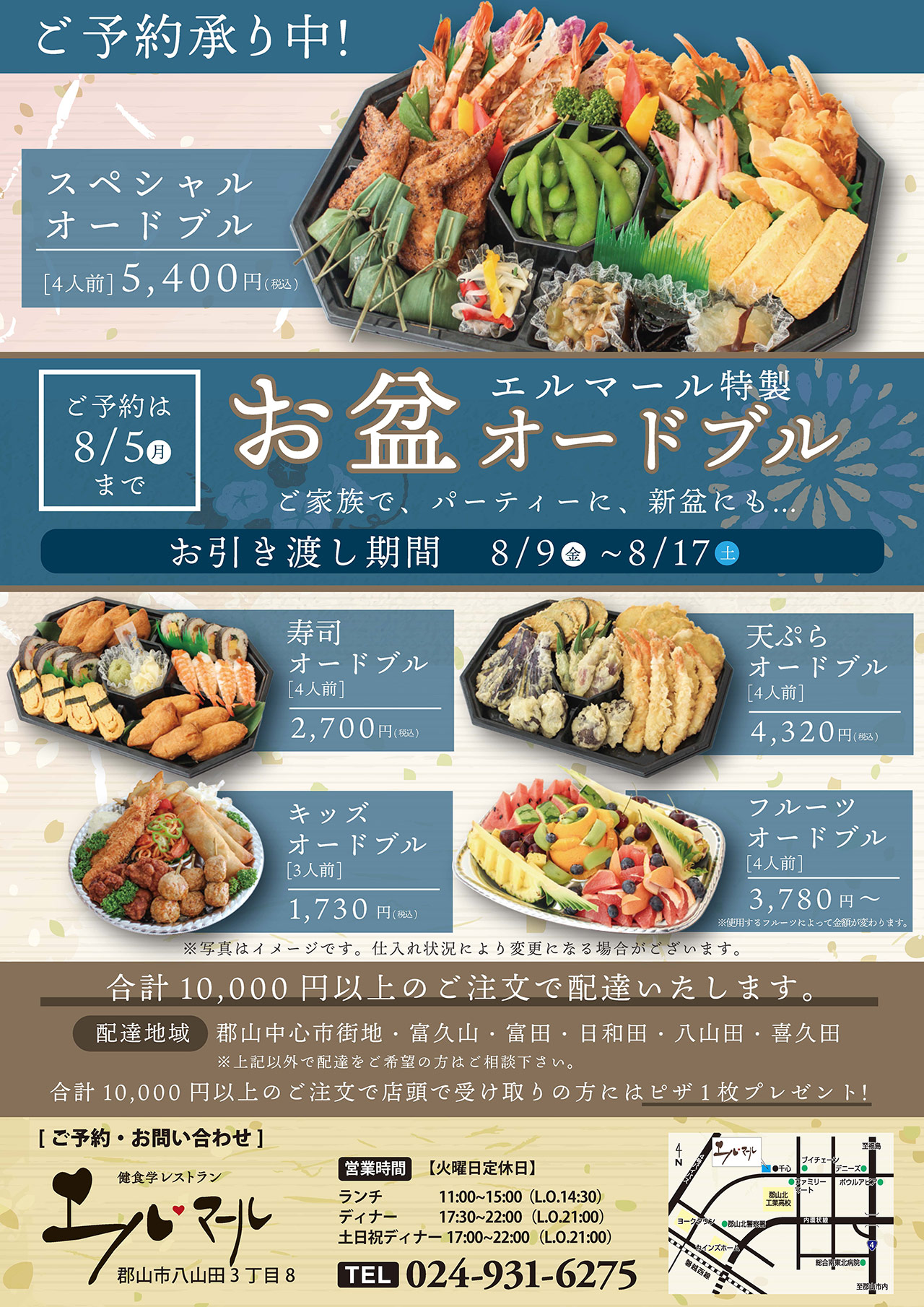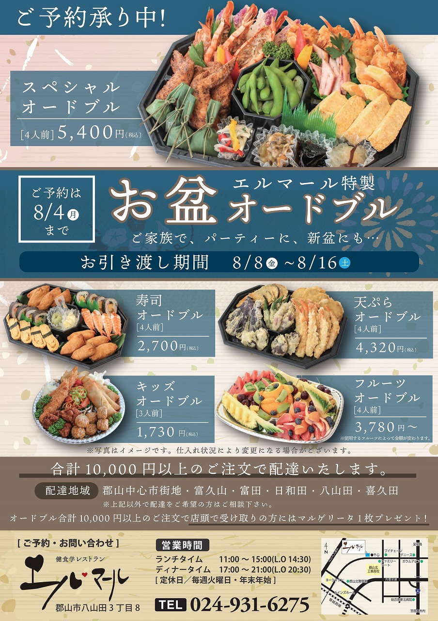 | 2025/8/1 | ★エルマール特製 お盆オードブル★ ご家族で、パーティーに、新盆にも… | |