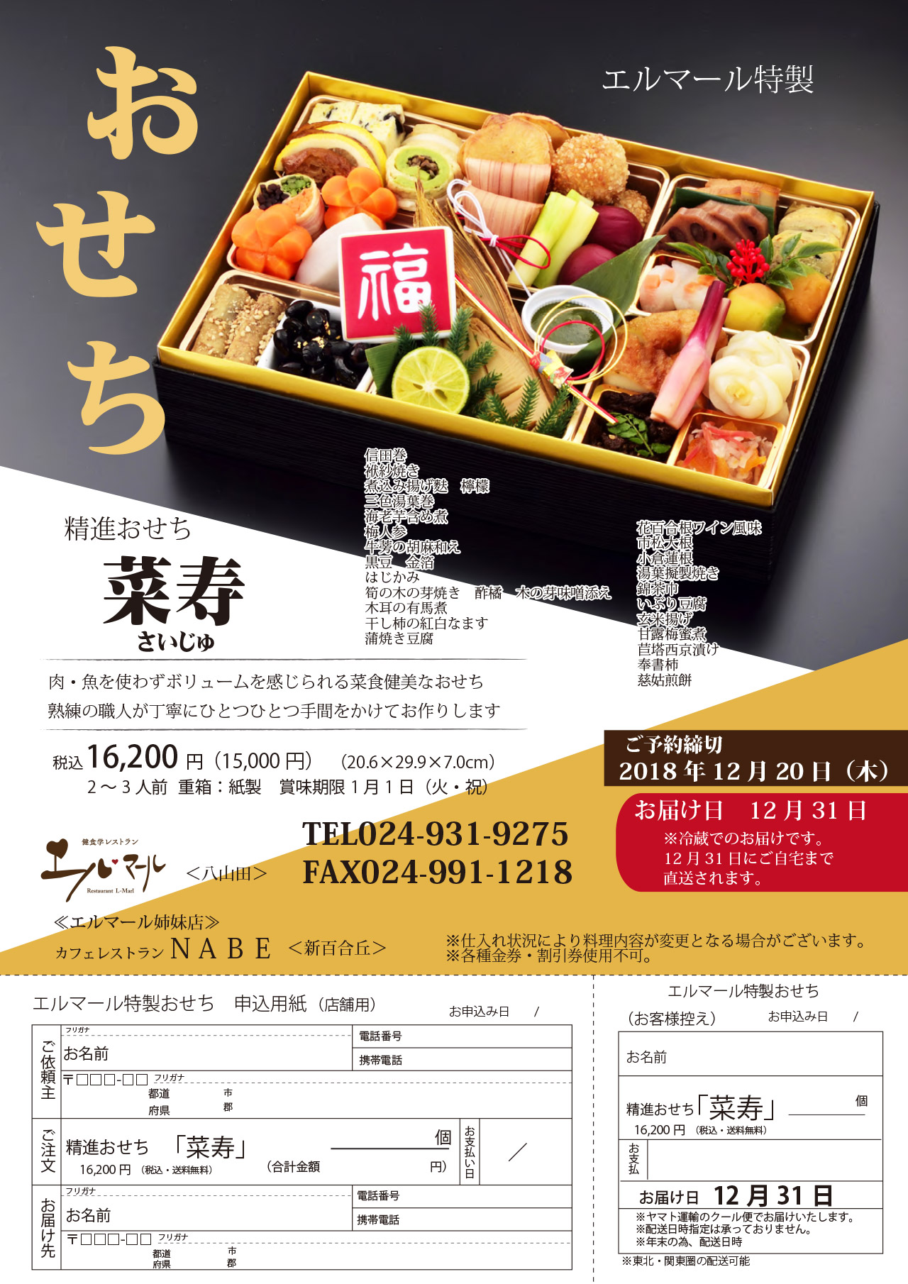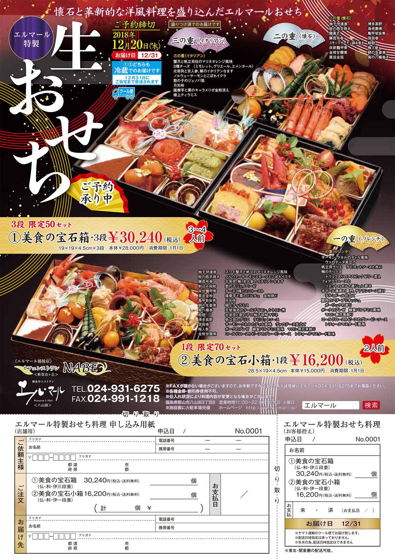 | 2018/11/1 | ★エルマール特製 生おせち★ 懐石と革新的な洋風料理を盛り込んだエルマールおせち | |