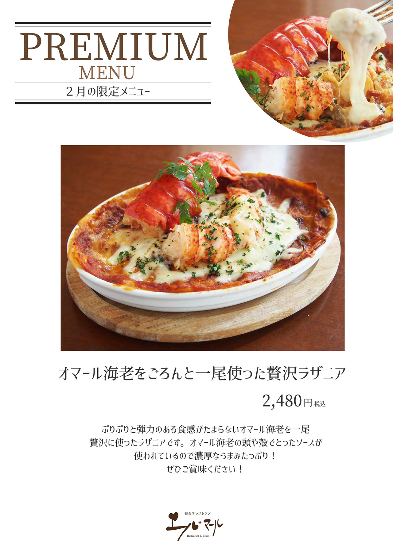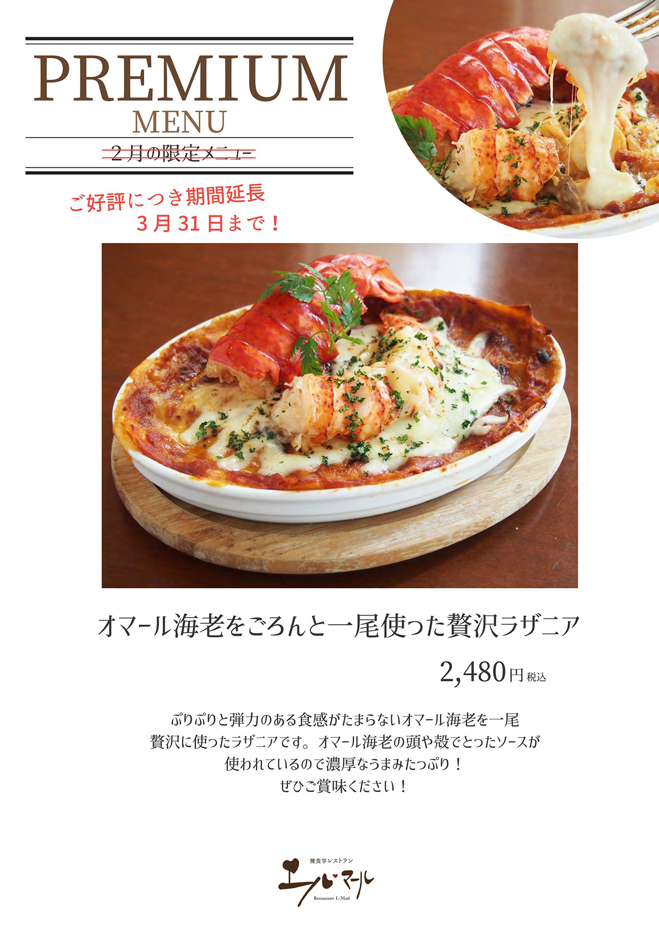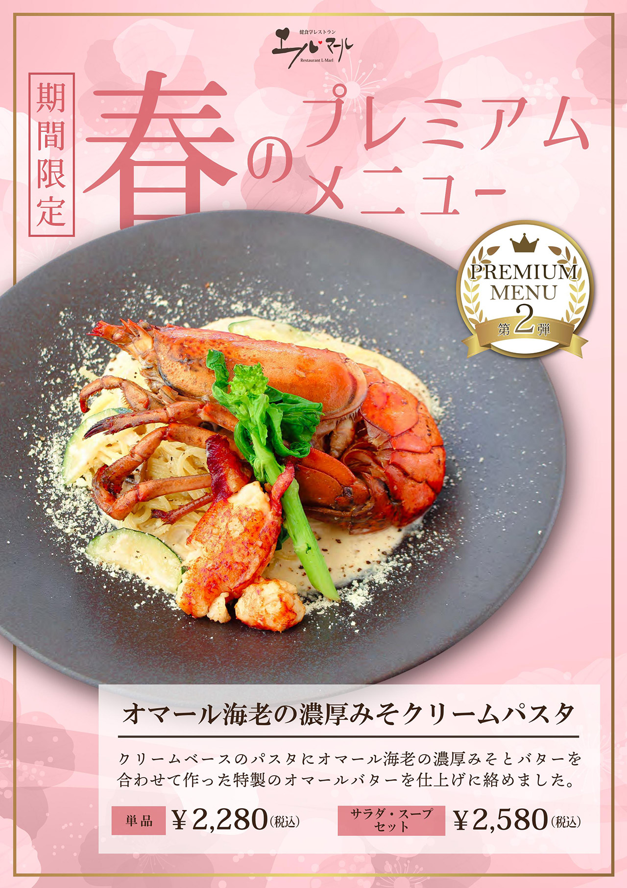 | 2024/2/28 | ★エルマール(八山田)★ 期間限定 春のプレミアムメニュー PREMIUM MENU 第2弾 「オマール海老の濃厚みそクリームパスタ」 | |