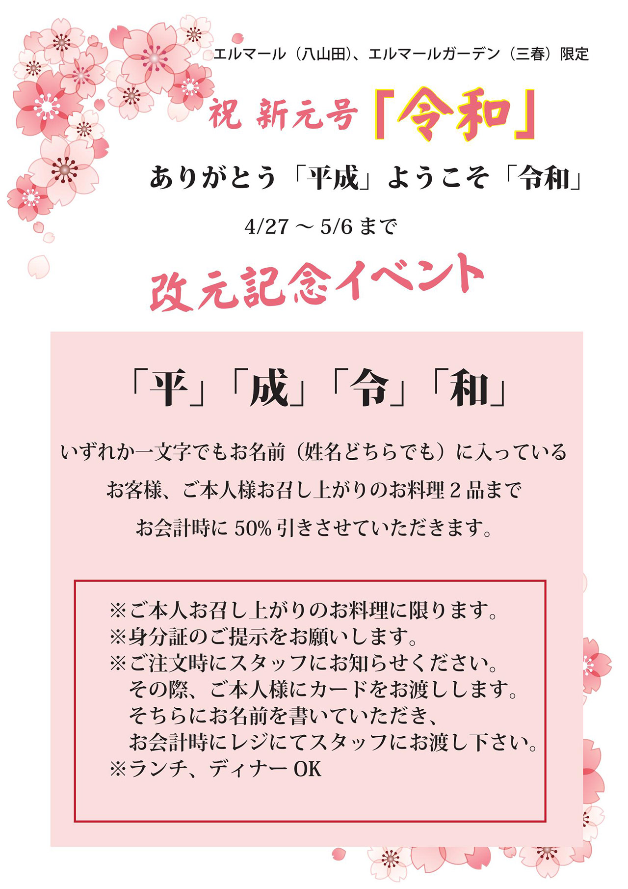 | 2019/4/25 | ★改元記念イベント★ 「平」「成」「令」「和」いずれか一文字でもお名前に入っているお客様50%引き。 | |
