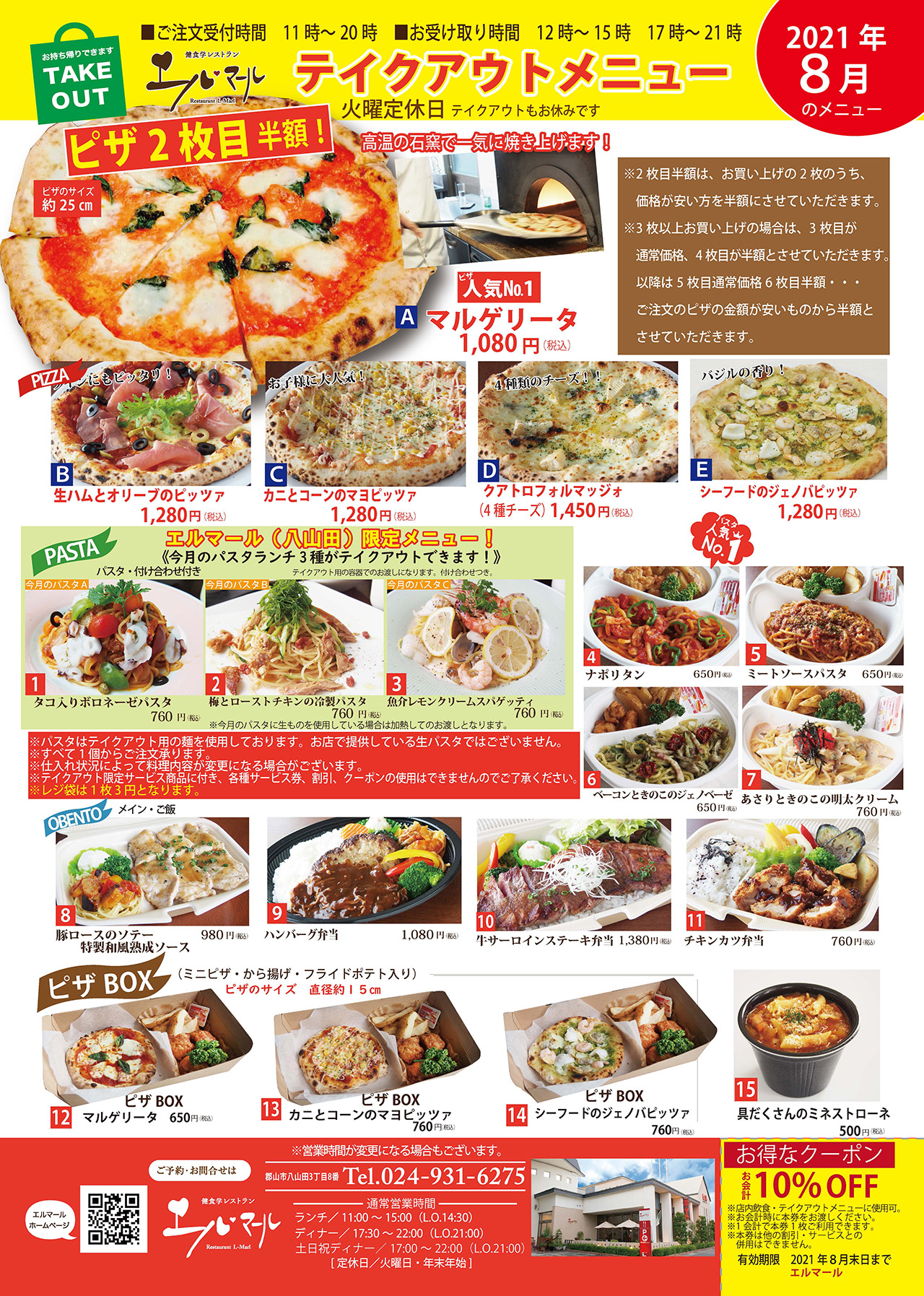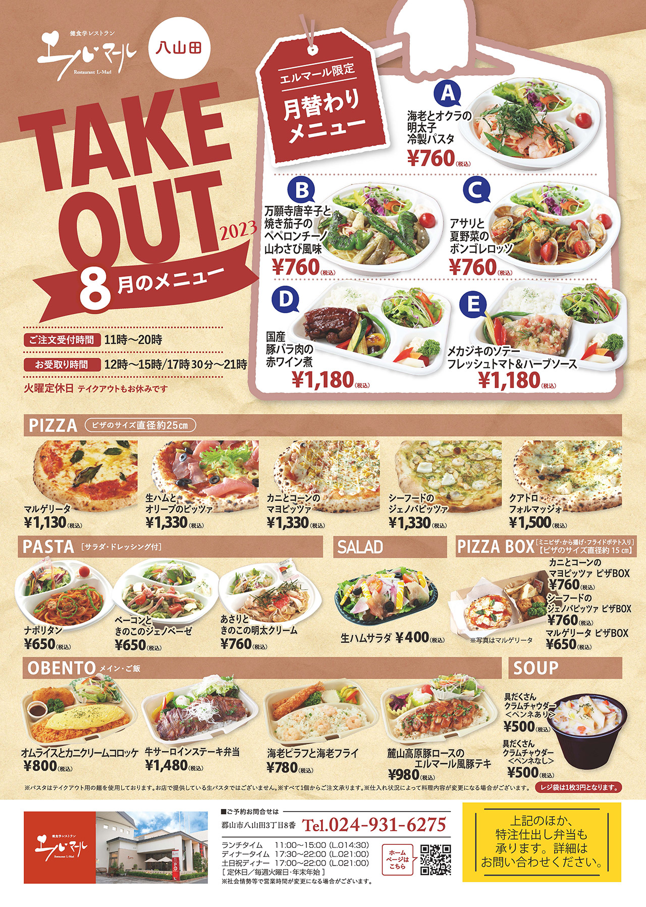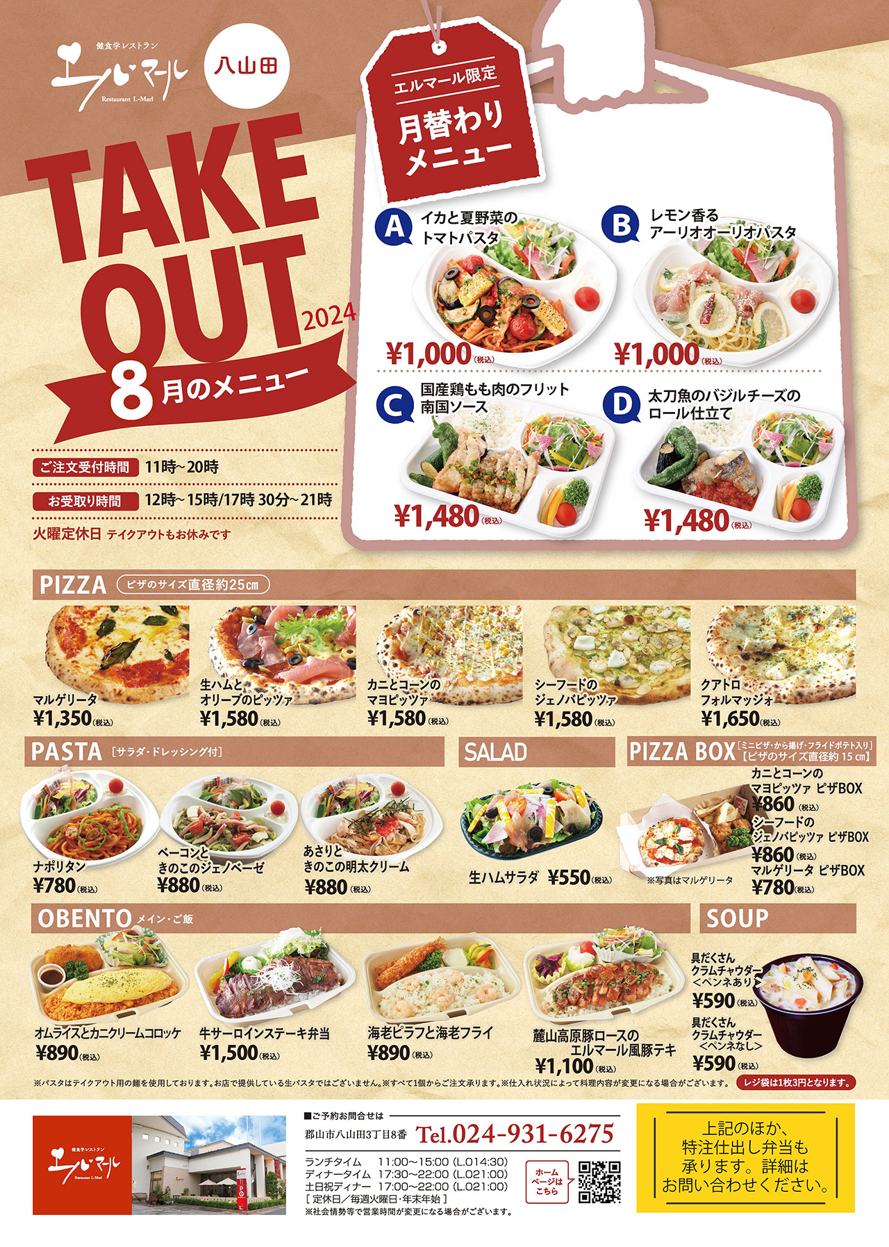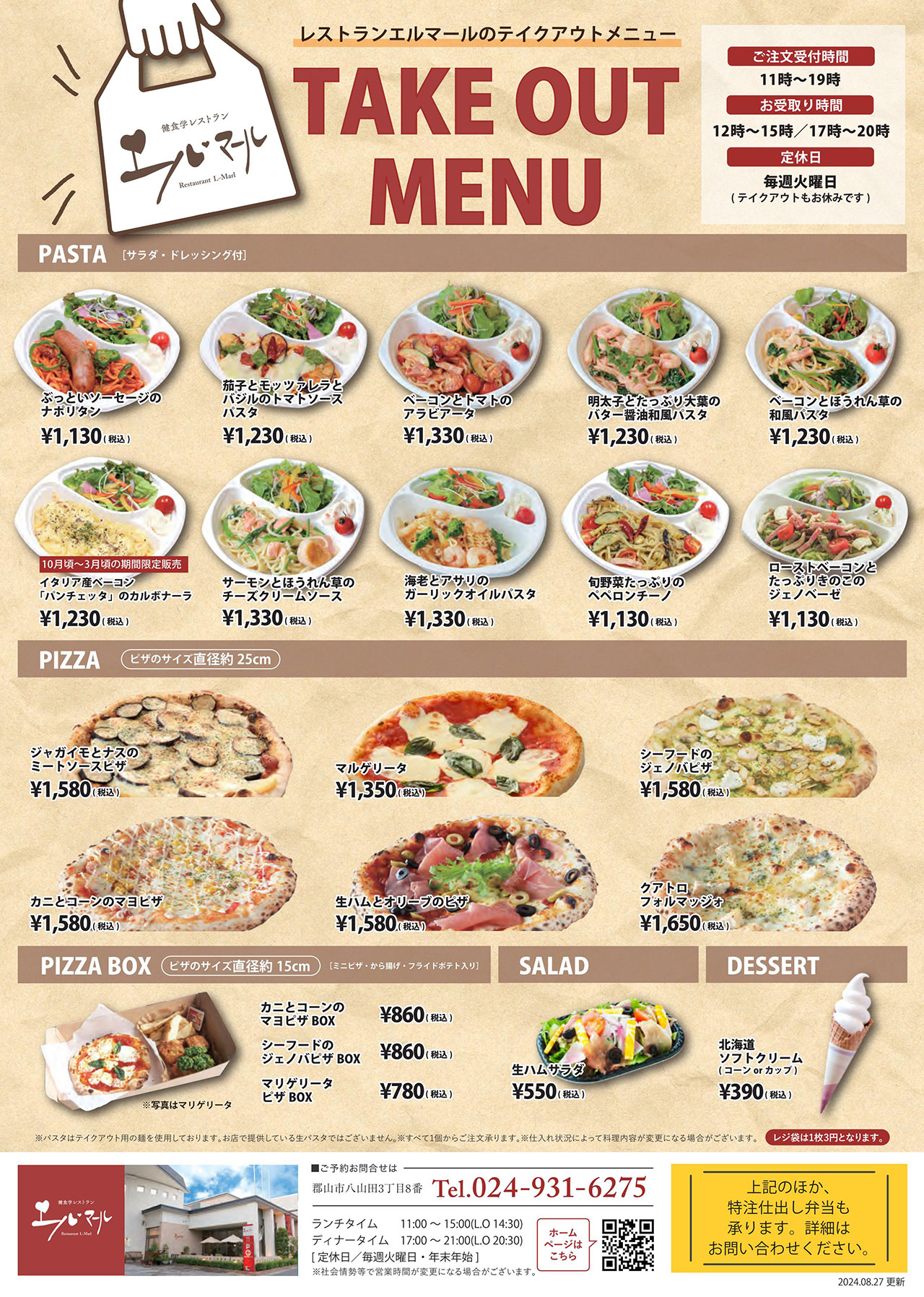 | 2024/8/30 | ★テイクアウトメニュー更新★ 【お持ち帰りできます】 【エルマール 9月のテイクアウトメニューはこちら】 | |