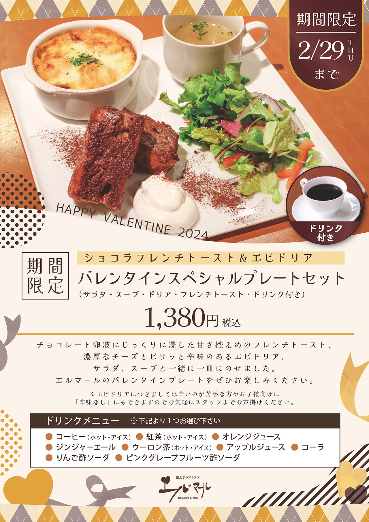 | 2024/1/23 | 【期間限定】 ★エルマール バレンタインスペシャルプレートセット★ ショコラフレンチトースト&エビドリア | |