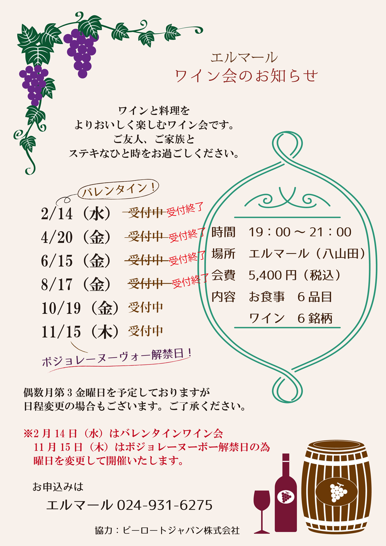 | 2018/2/13 | ★ワイン会のお知らせ更新★ ワインとお料理をよりおいしく楽しむワイン会です。 | |