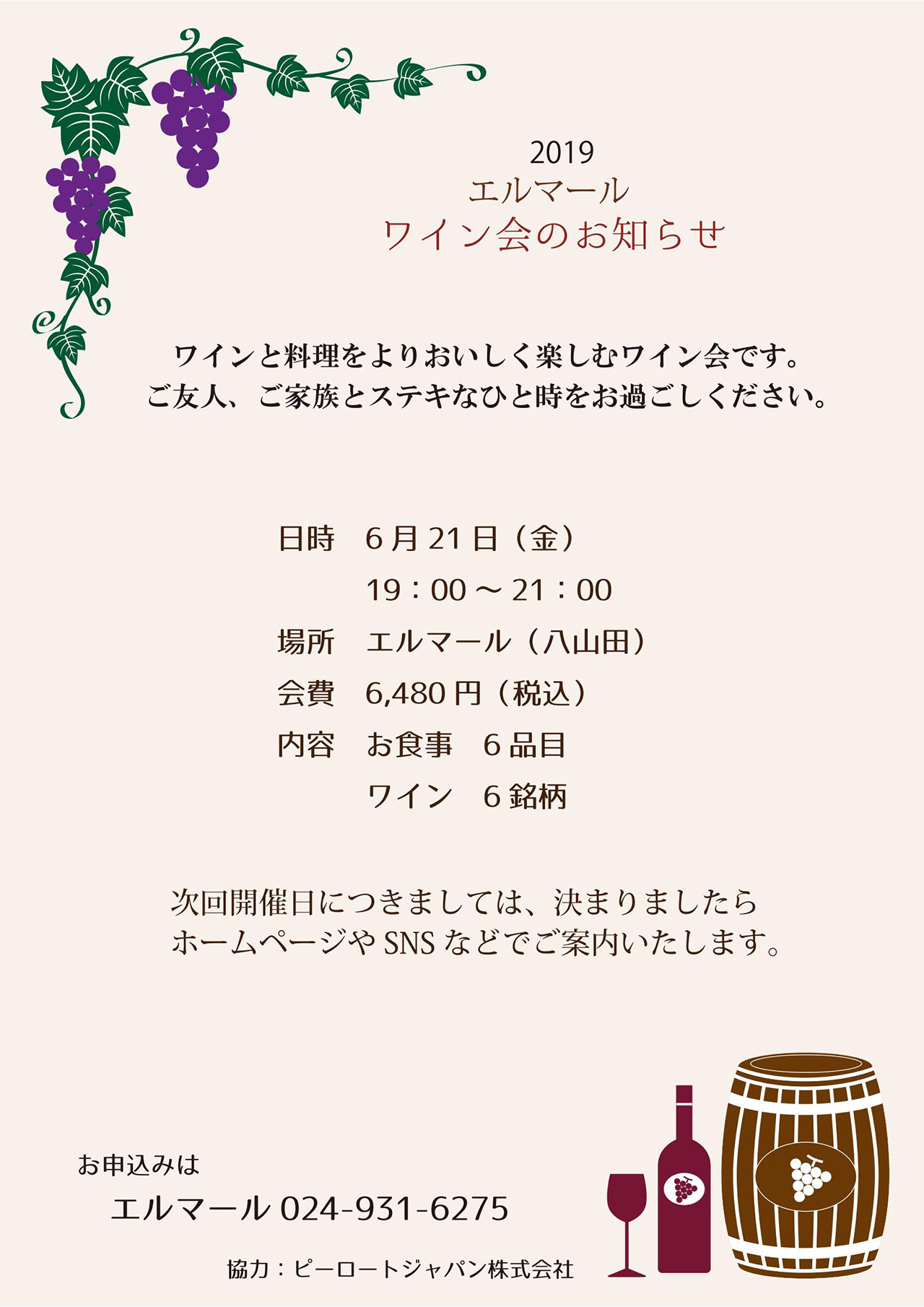 | 2019/6/21 | ★ワイン会のお知らせ★ ワインとお料理をよりおいしく楽しむワイン会です。 | |