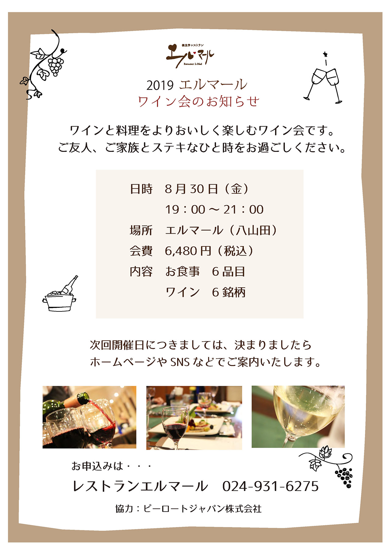 | 2018/7/30 | ★ワイン会のお知らせ更新★ ワインとお料理をよりおいしく楽しむワイン会です。 | |