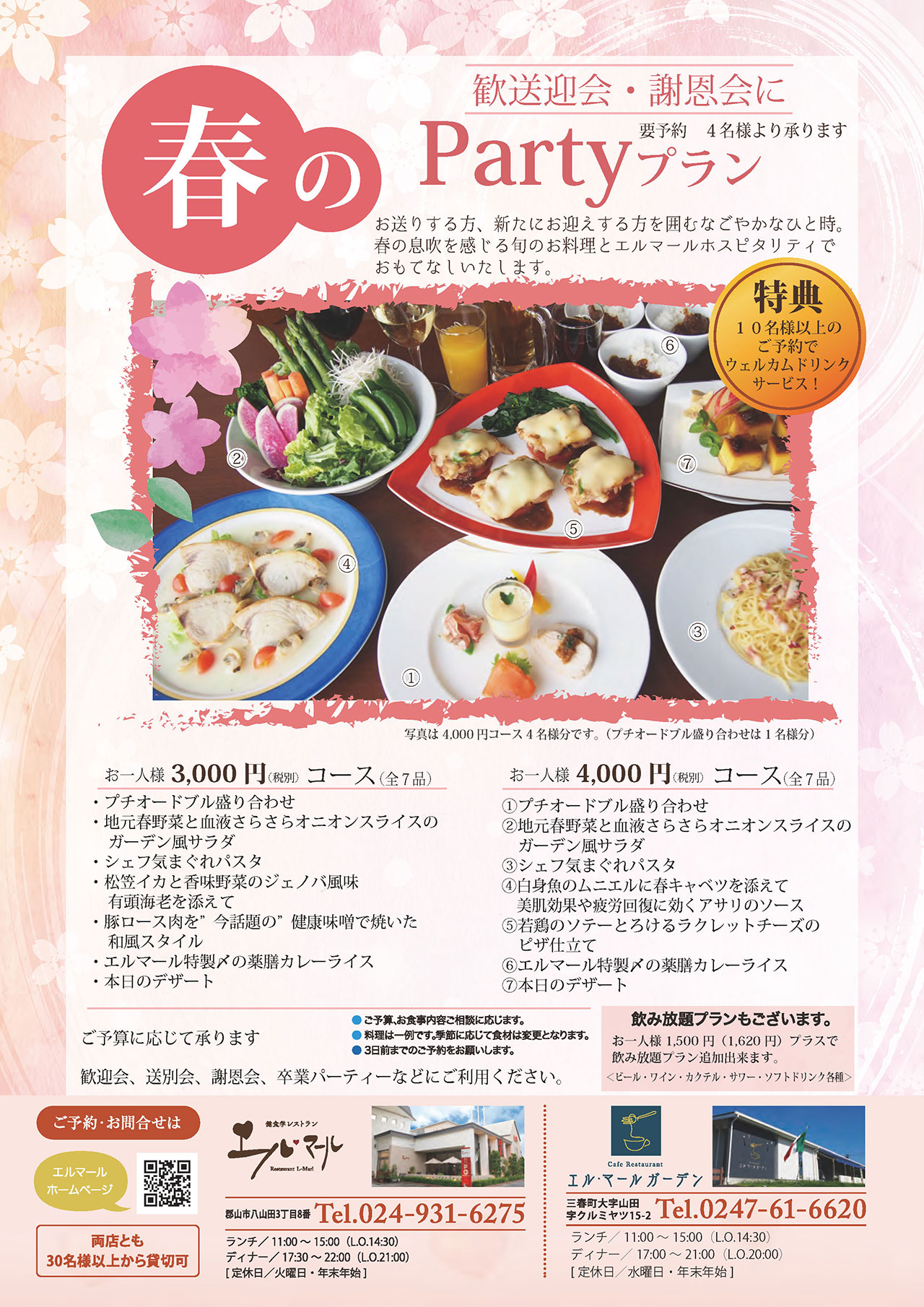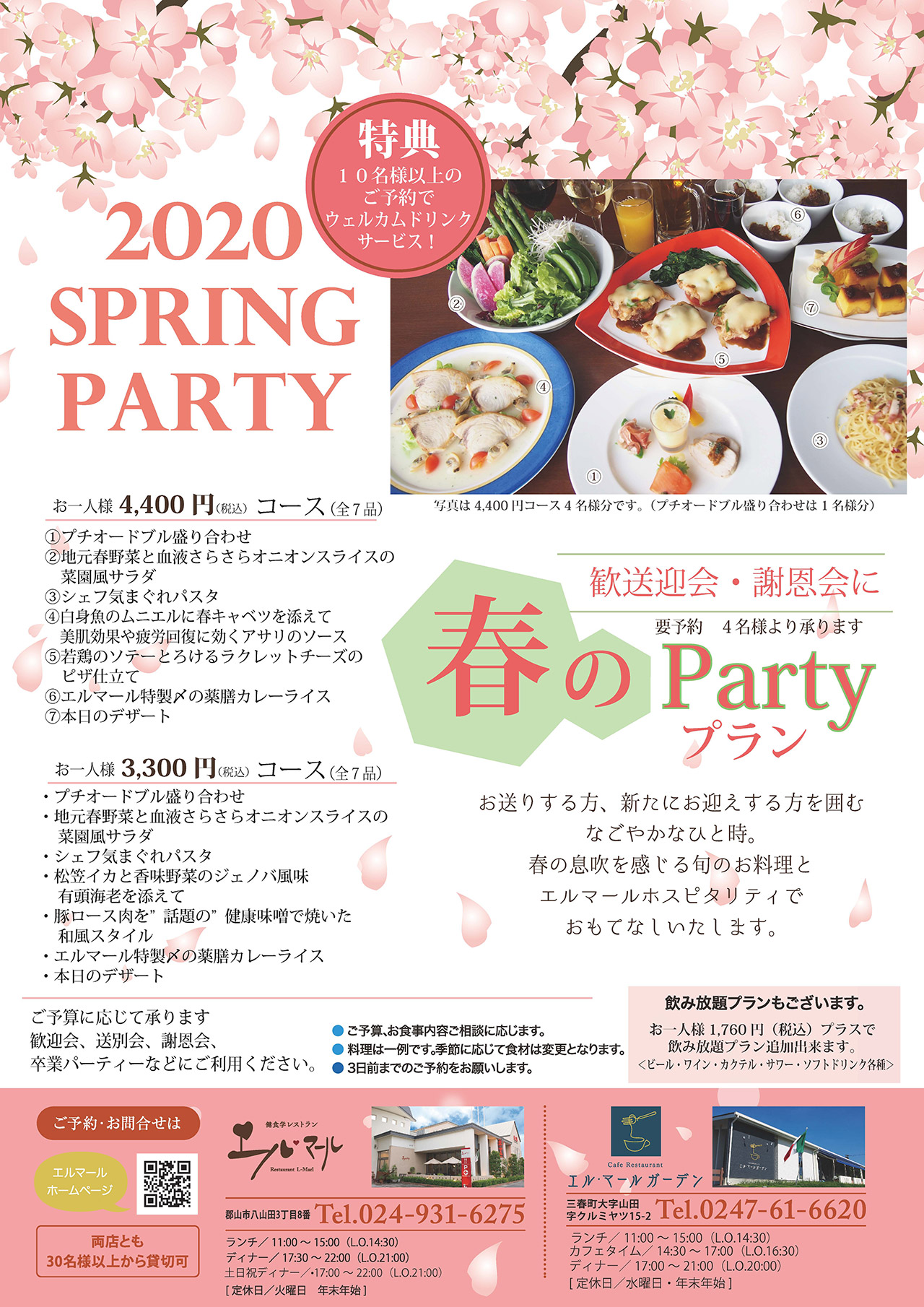 | 2019/2/21 | ★エルマール・エルマールガーデン共通 春のPartyプラン★ 要予約 4名様より | |