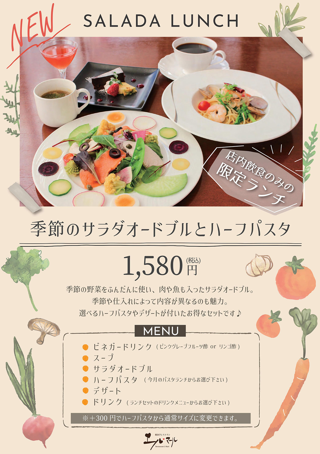 | 2024/4/22 | ★エルマール(八山田)★ 「サラダランチ」テレビで紹介されました♪ <季節のサラダオードブルとハーフパスタ> 季節の野菜をふんだんに使い、肉や魚も入ったオードブル。選べるハーフパスタやデザートがついたお得なセットです♪ | |